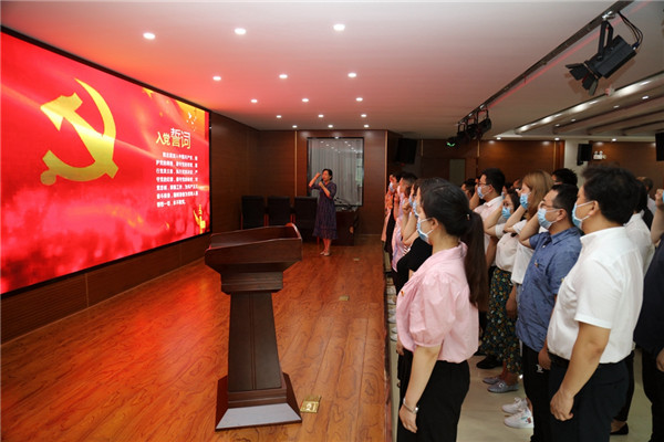 大会在庄严肃穆的国际歌中开场。周萍宣读了刘凯芮、王延丰等38名新发展党员名单。随后,新党员与老党员代表在王倩带领下,面对党旗,举起右手,庄严宣誓,铮铮誓言在会场上空回荡。