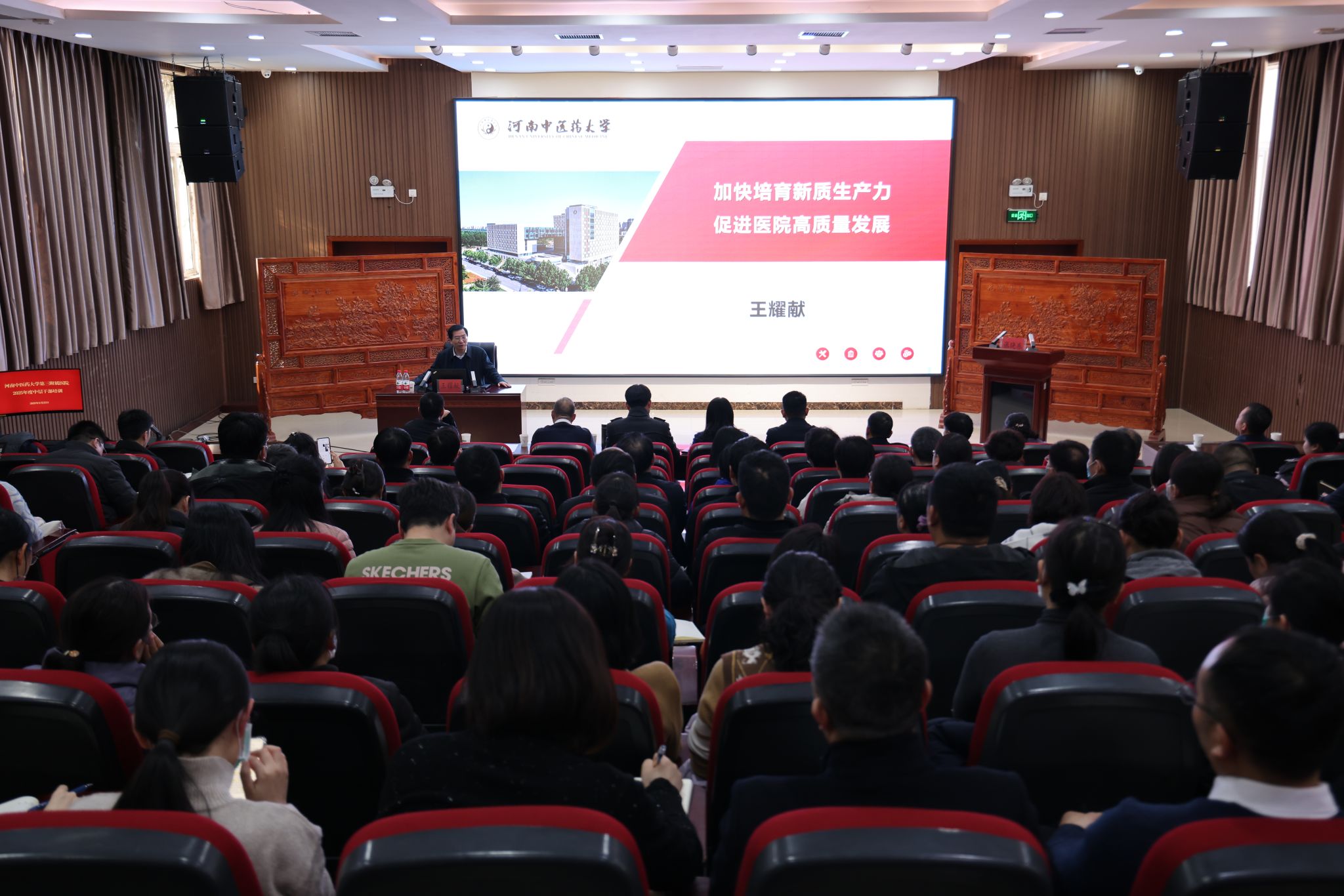 本网讯(文/李冕 图/潘向昆)春潮涌动催人进,扬帆奋进正当时。为完整、准确、全面贯彻新发展理念,持续深化改革创新,以新质生产力为附属医院高质量发展赋能增效,2025年2月25日,校长王耀献以《加快培育新质生产力,促进医院高质量发展》为题,为三附院中层干部作专题报告。学校办公室相关负责人、三附院党政班子成员、中层干部等参加讲座,三附院党委书记张晓东主持会议。