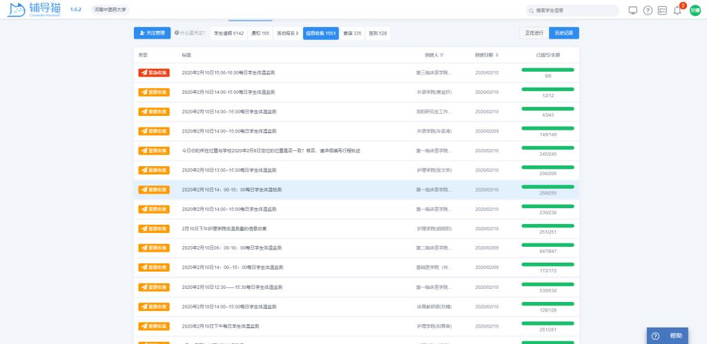 各学院通过“辅导猫”监测学生体温,坚持每日上报
