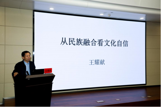 王耀献结合中华民族五千年历史,分别从历史科普、民族科普、民族融合、文化自信等四个维度向大家进行了阐释。他指出,中华民族五千年历史经历分分合合,但统一的大趋势从未改变,且每一次统一都前所未有地促进了民族的大融合,要从历史逻辑、理论逻辑、实践逻辑三个层面理解中华民族共同体。他表示,中华民族共同体意识是国家统一之基、民族团结之本、精神力量之魂。各族文化交相辉映,中华文化历久弥新,这是今天我们强大文化自信的根源。加强中华民族大团结,长远和根本的是增强文化认同,建设各民族共有精神家园,铸牢中华民族共同体意识。辅导员要坚持把铸牢中华民族共同体意识作为落实立德树人根本任务的具体要求,让中华民族共同体意识根植青年学生心灵。伴随着王耀献的精彩讲解,全体参训人员沉浸在与历史的对话中,真切感受到“一部中国史,就是一部各民族交融汇聚成多元一体中华民族的历史,就是各民族共同缔造、发展、巩固统一的伟大祖国的历史。”