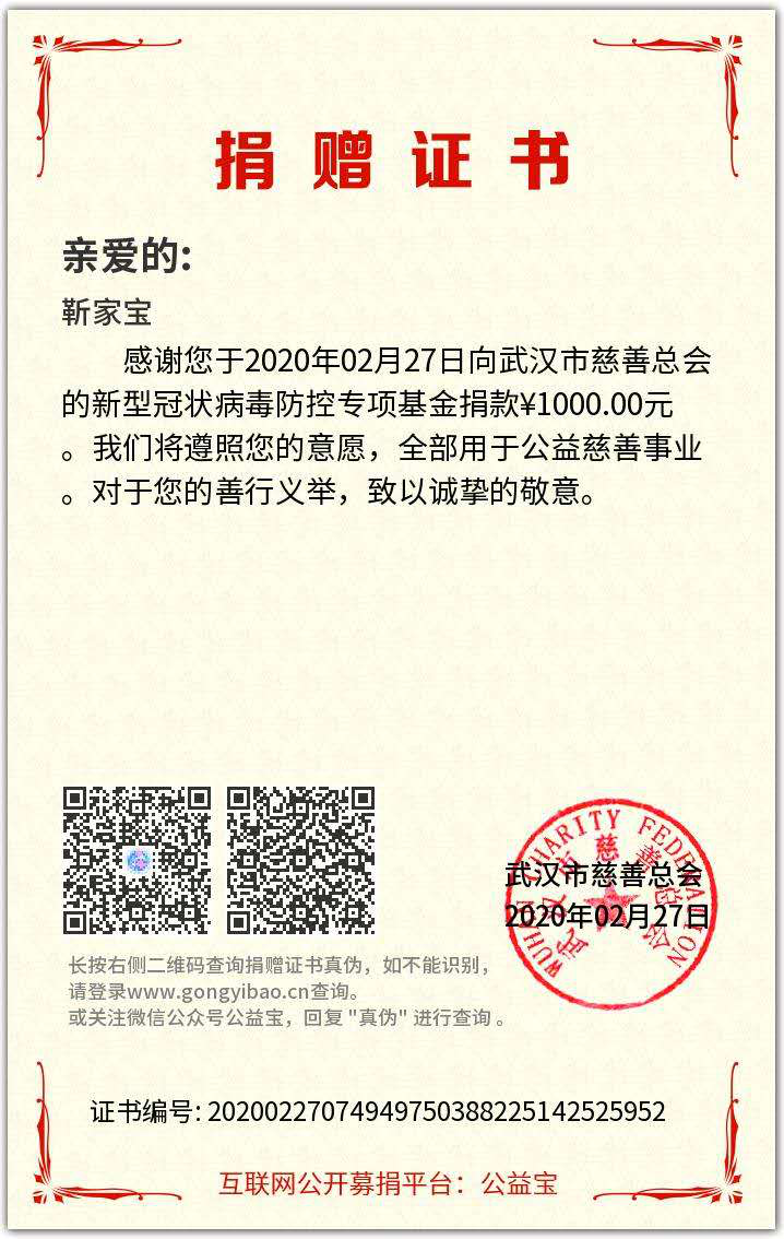 本网讯(文图/任滢 张静)2020年2月27日,为响应党中央对广大党员的号召,马克思主义学院2017级研究生党员靳家宝向武汉市慈善总会捐款1000元。当这一消息被马克思主义学院“初心”学习社的研究生同学知晓后,他们纷纷表示,响应党中央号召,向靳家宝同学学习,量力而行、主动奉献,于3月7日再次募集了3000元交付学校疫情防控工作领导小组,用于支持学校的新冠肺炎疫情防控工作。