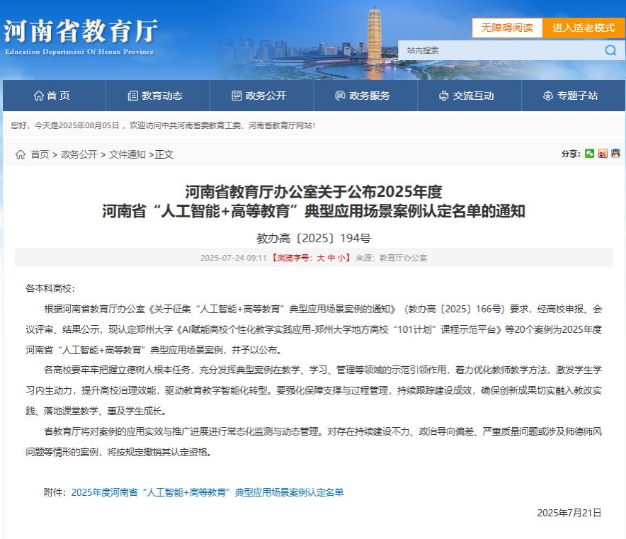 本次“人工智能+高等教育”典型应用场景案例征集,旨在加快人工智能在高等教育领域的创新应用,利用智能技术支撑人才培养模式的创新、教学方法的改革、教育治理能力的提升,构建智能化、网络化、个性化、终身化的教育体系。全省共遴选出20个典型案例。在综合评审和公示后,包含leyu·乐鱼(中国)体育官方网站案例在内的5个案例被河南省推荐参评教育部“人工智能+高等教育”应用场景典型案例。