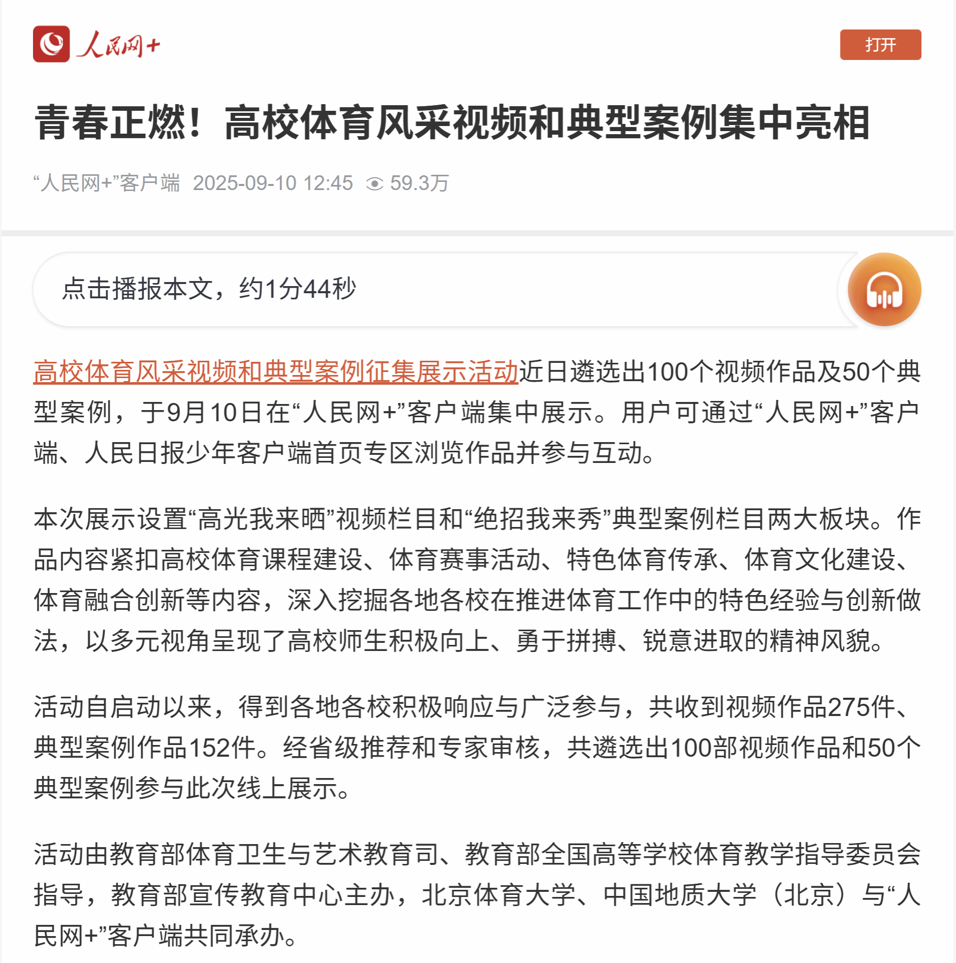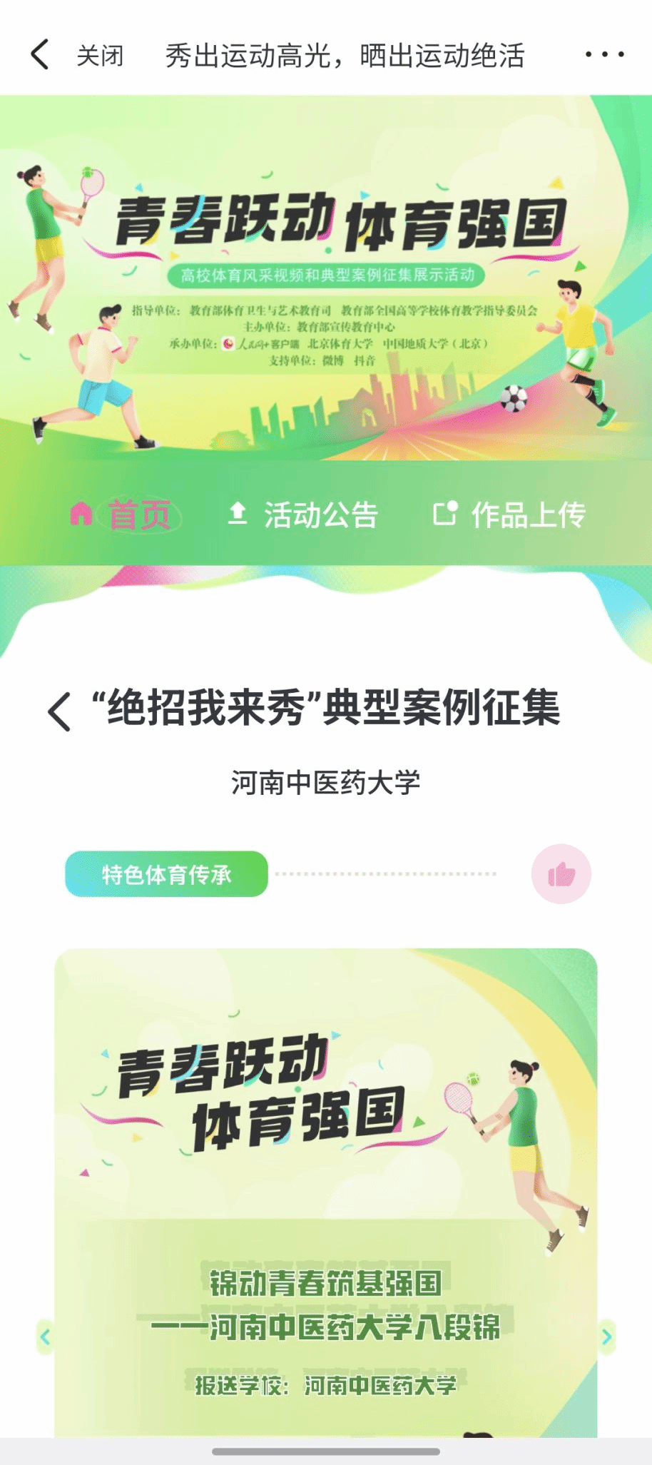 本网讯(文/图 王静)近日,教育部体育卫生与艺术教育司、教育部全国高等学校体育教学指导委员会指导,教育部宣传教育中心主办的高校体育风采视频和典型案例征集展示活动,遴选出100个视频作品及50个典型案例,于9月10日在 “人民网 +”客户端集中展示。leyu·乐鱼(中国)体育官方网站“锦动青春 筑基强国——leyu·乐鱼(中国)体育官方网站八段锦”案例成功入选。广大师生、社会各界人士可通过 “人民网 +”客户端、人民日报少年客户端leyu·乐鱼(中国)体育官方网站专区浏览作品并参与互动。
