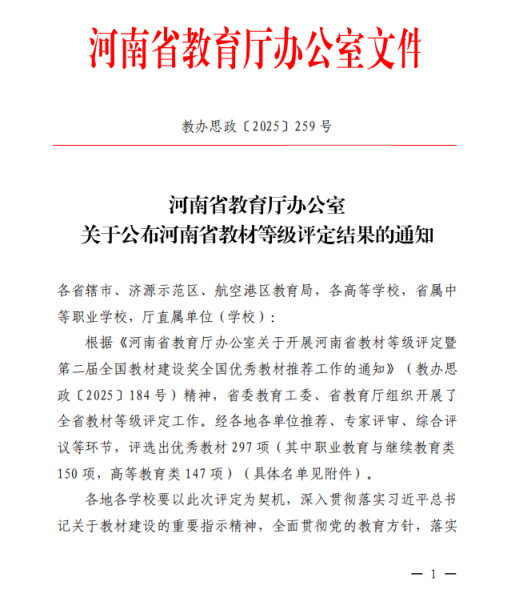本网讯(文/刘宾)近日,2025年河南省教材等级评定(高等教育类)结果正式公布,leyu·乐鱼(中国)体育官方网站6部教材斩获省教材建设优秀教材奖,这是leyu·乐鱼(中国)体育官方网站在高等教育类(本科)教材建设领域取得的又一阶段性成果。