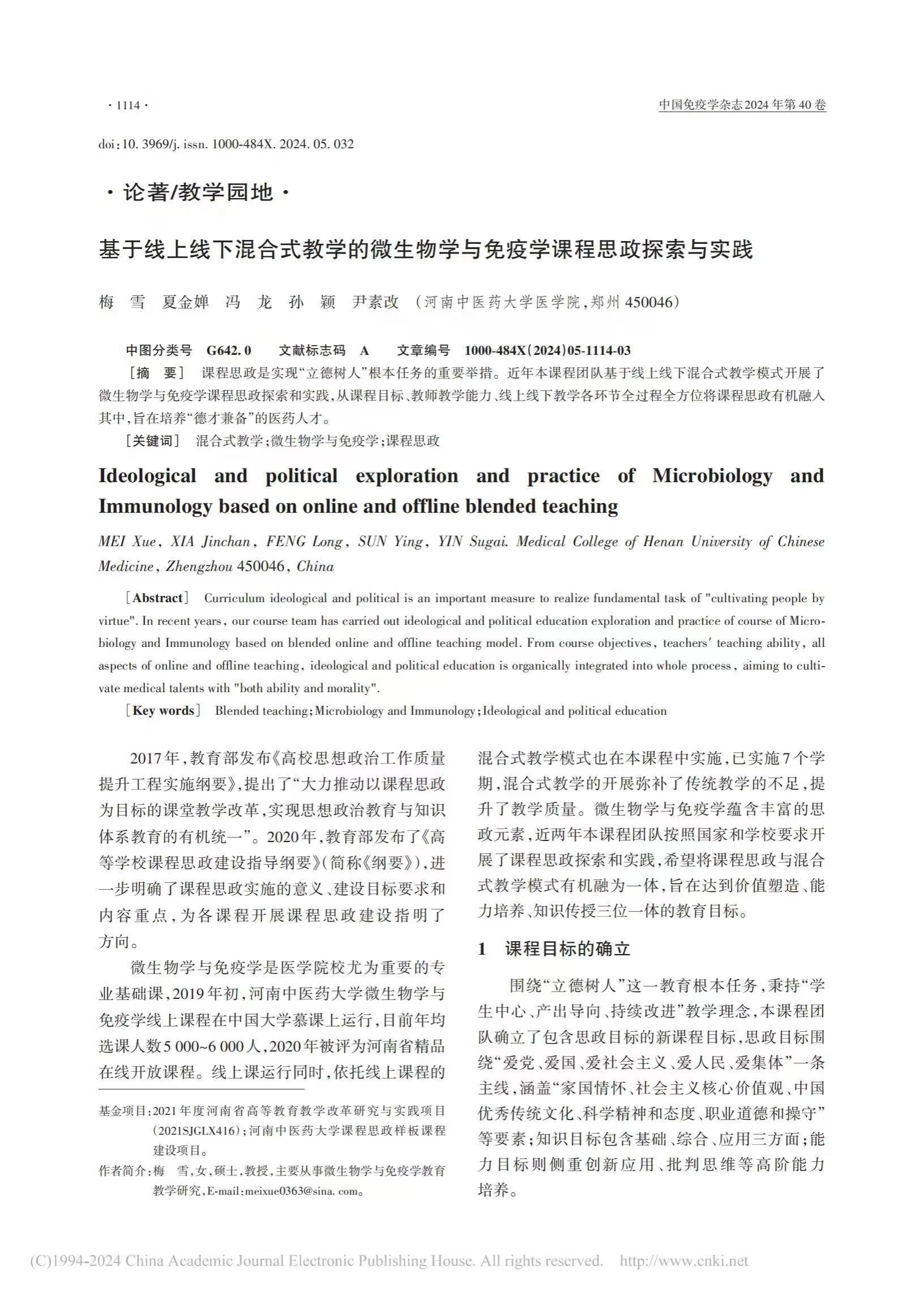 leyu·乐鱼(中国)体育官方网站医学院梅雪老师带领的《微生物学与免疫学》教学团队近日在《中国免疫学杂志》(中文核心期刊)发表教研论文,为医学院的教学研究成果添砖加瓦。该论文题目为《基于线上线下混合式教学的《微生物学与免疫学》课程思政探索与实践》,刊于《中国免疫学杂志》2024年第5期上。