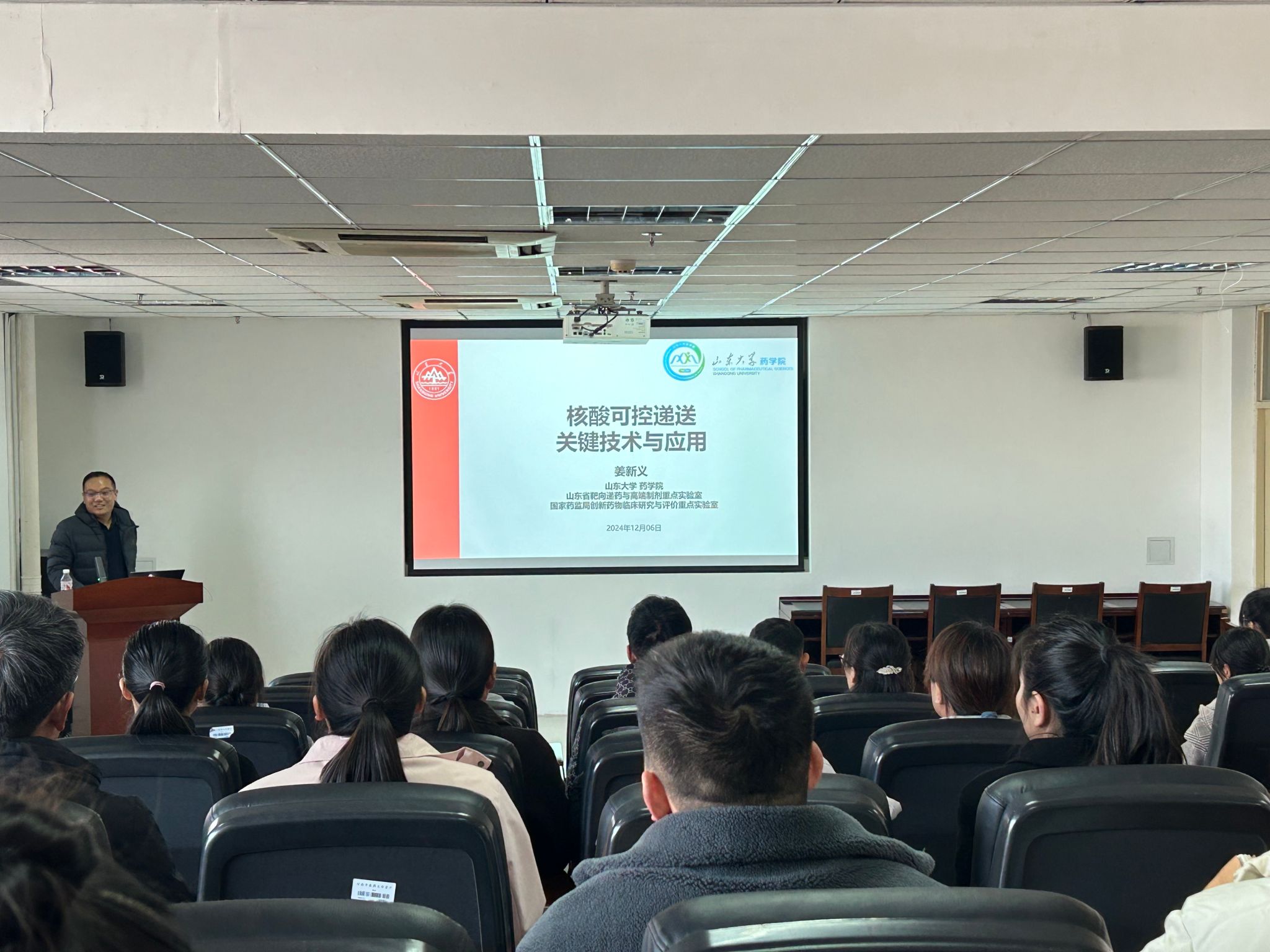 本网讯(文图/吴灿)为拓宽科研工作者的专业思维,提高科研创新能力。2024年12月6日,由药学院(中药制药技术与装备行业学院)主办的学术讲座活动在综合楼BN617成功举办。会议邀请国家杰青、山东大学姜新义教授作题为“核酸药物可控递送与应用”的学术讲座,leyu·乐鱼(中国)体育官方网站百余名师生参加讲座。会议由药学院副院长刘瑞新主持。
