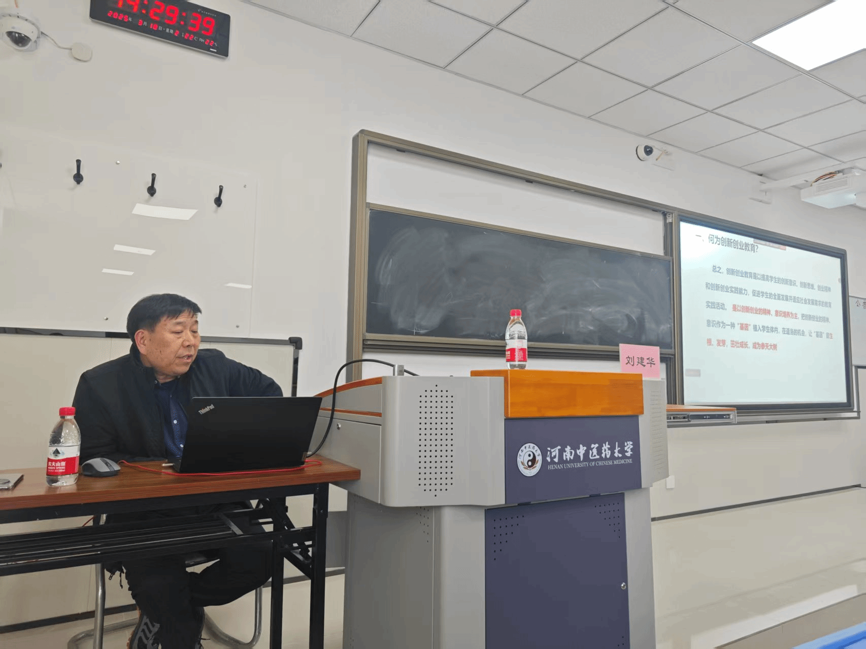 在讲座中,刘建华教授深刻阐述了创新创业教育的内涵和国内外发展历程,介绍了高校创新创业教育五种主要的理论教学、实践教学机制和形式。随后,以中国国际大学生创新大赛为例,从技术创新、商业模式、社会价值、教育引领和团队组成等五个维度解读了评审要点,以及如何针对评审要点进行高质量项目选题,并从七个方面讲解如何打造具有竞争力和感染力的创新创业项目。同时,他以亲身指导并获国家级银奖的“互联网+”创新创业项目为案例,分享了项目痛点、核心技术、经典案例、效果分析、核心团队和营销推广等方面的丰富经验,并建议学院师生做好创新创业项目的提前布局、资源整合、中医交叉和精进提升。