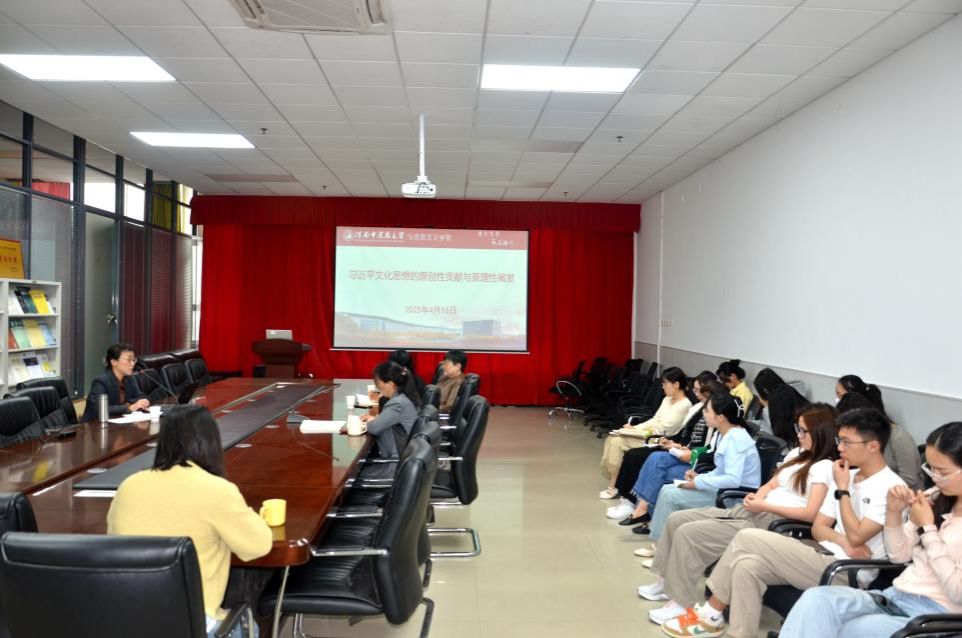 本网讯(文/朱振杰 图/王彦明)为深入把握习近平文化思想的核心要义及其内在逻辑,进一步强化理论学习、提升专业素养,2025年4月16日,郑州大学马克思主义学院教授、博士生导师谷佳媚受邀为马克思主义学院师生作“习近平文化思想的原创性贡献与原理性阐发”专题学术讲座。马克思主义学院教师代表及全体研究生参加此次讲座。