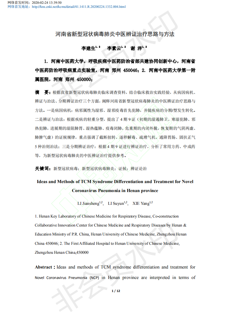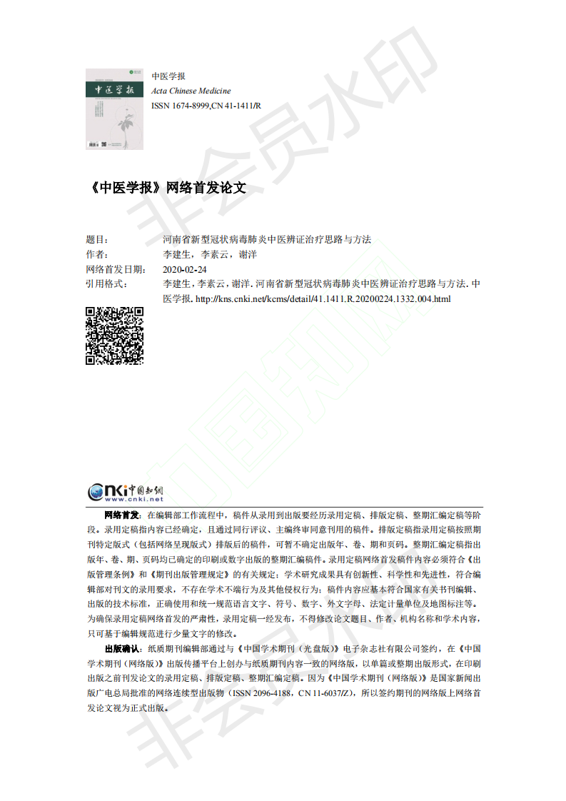 为更好地发挥该要点的指导及应用价值,《中医学报》特约李建生教授撰写了《河南省新型冠状病毒肺炎中医辨证治疗思路与方法》一文(2月20日收稿),并于2020年2月24日网络首发。文章通过分析研究我省新型冠状病毒肺炎临床调查资料,结合临床救治实践经验,从病因病机、辨证与治法、分期辨证治疗三个方面,阐释了河南省新型冠状病毒肺炎的中医辨证治疗思路与方法。现将李建生教授的《河南省新型冠状病毒肺炎中医辨证治疗思路与方法》转发于此,以供参考和借鉴。