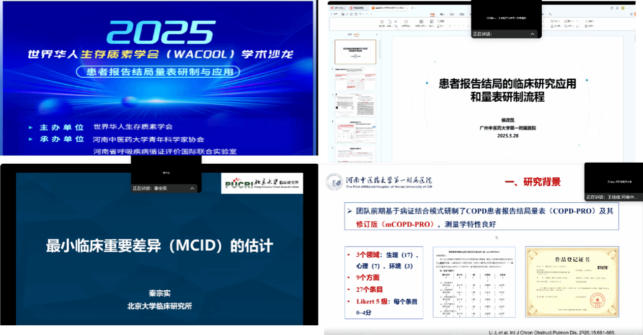 本网讯(文/刘明昊 图/张琪振)为营造良好的学术科研氛围,世界华人生存质素学会、leyu·乐鱼(中国)体育官方网站青年科学家协会于2025年5月28日联合举办《患者报告结局量表研制与应用》线上科研沙龙活动,会议邀请到广州中医药大学第一附属医院侯政昆教授、北京大学临床研究所秦宗实教授、leyu·乐鱼(中国)体育官方网站王佳佳教授进行学术报告。世界华人生存质素学会、青年科学家协会会员及附属医院科研人员线上参会,世界华人生存质素学会万崇华会长讲话,青年科学家协会副秘书长谢洋、医学学部主任刘鸣昊主持会议。