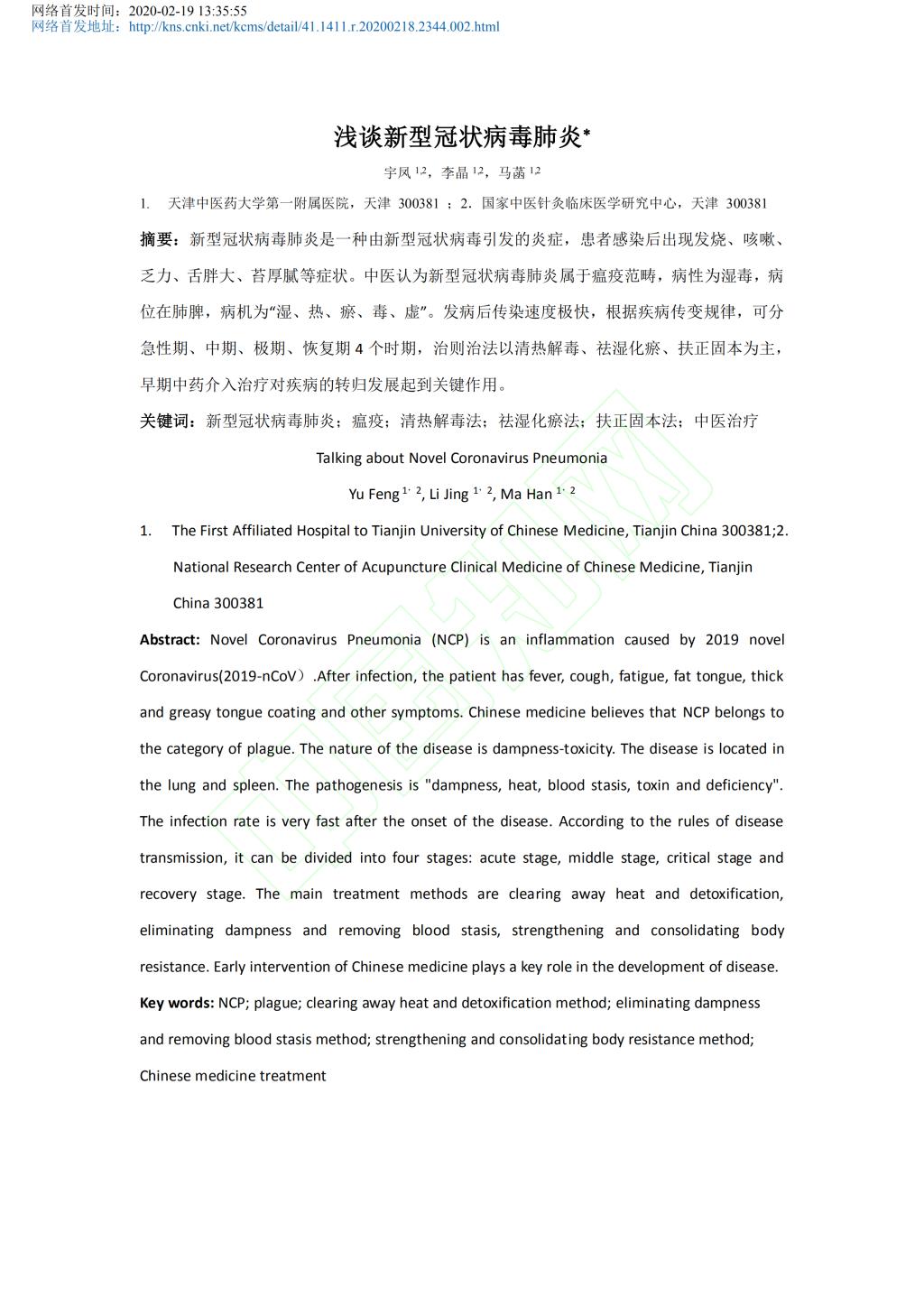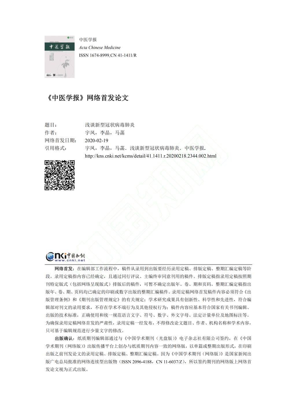 《中医学报》网络首发中医药防治新冠肺炎论文《浅谈新型冠状病毒肺炎》