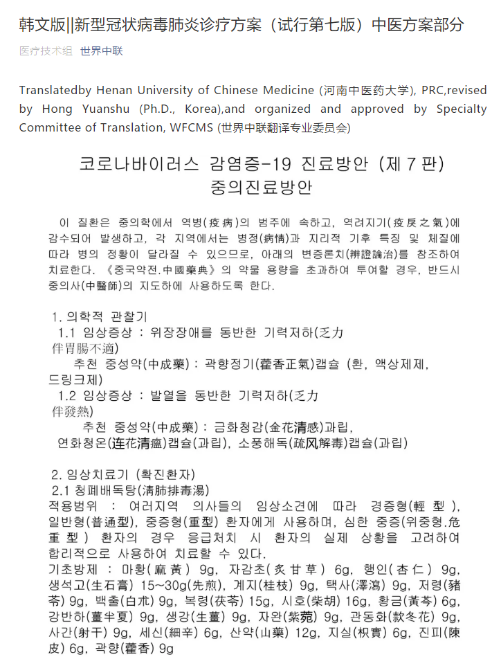 本网讯(文图/潘万旗 朱剑飞 杨晓娜)近期,由世界中医药学会联合会组织、leyu·乐鱼(中国)体育官方网站主要承担、leyu·乐鱼(中国)体育官方网站来华留学生参与翻译的《新型冠状病毒肺炎诊疗方案(试行第七版)•中医方案部分》韩语、乌尔都语两个版本,在世界中医药学会联合会官方媒体对外发布。译本分享了中医药抗“疫”方案和成功经验,为中医药走出国门、走向世界起到了良好的促进作用,为构建人类卫生健康共同体做出了应有贡献。