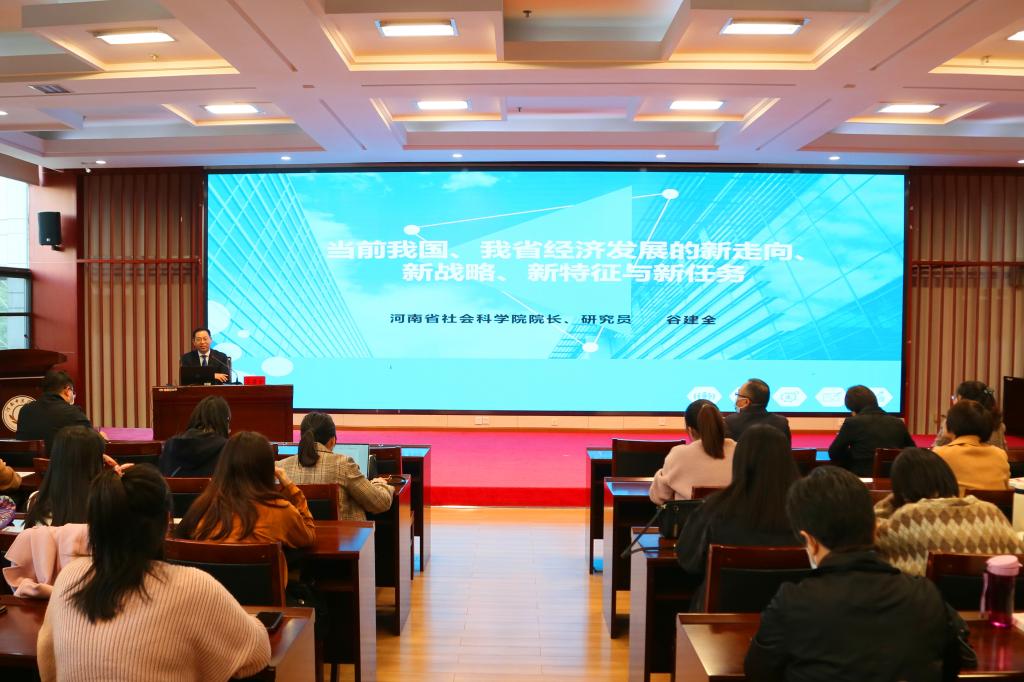 本网讯(文图/庞亚宾)2020年11月12日下午,河南省社会科学院谷建全院长应邀做客leyu·乐鱼(中国)体育官方网站公共管理论坛。谷建全紧密结合党的十九届五中全会精神,以《当前我国、我省经济发展的新走向、新战略、新特征与新任务》为主题,为leyu·乐鱼(中国)体育官方网站管理学院、马克思主义学院的教师、研究生和本科生100余人作专题报告。报告由校党委委员、副校长徐江雁教授主持。