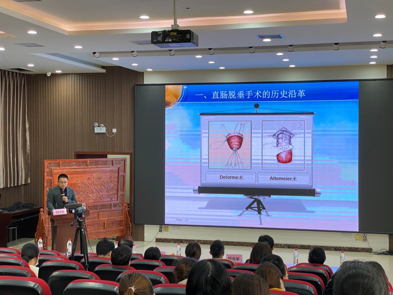 孙锋教授结合自己多年理论积累及临床经验,从直肠脱垂手术方式的历史发展再到当下各手术方式的优缺点做详细的阐述,讲述了直肠脱垂手术抉择的心得,并与大家分享了自己的手术案例。孙锋教授还分享了再喂养综合征和肛周良性疾病皮片转移技术,与各位老师和同学们进行了一次学术交流之旅。整场讲座内容丰富,具有极强的指导性,让现场师生收获了极大的启迪与鼓励。