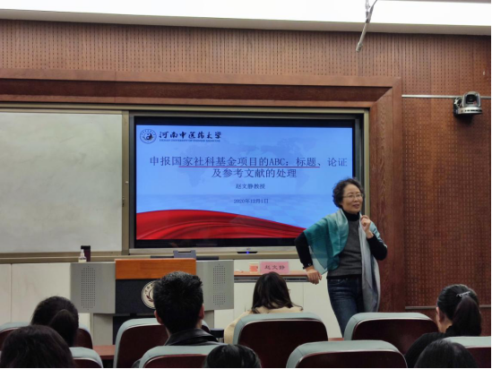 本网讯(文/蒋宜轩 图/池晓华)2020年12月1日下午,由科学技术处主办、外语学院承办的“百家论坛”在教学楼A633举行。河南师范大学赵文静教授应邀作了题为“申报国家社科基金项目的ABC:标题、论证及参考文献的处理”的专题讲座,leyu·乐鱼(中国)体育官方网站100多名师生聆听讲座。讲座由外语学院副院长朱文晓主持。