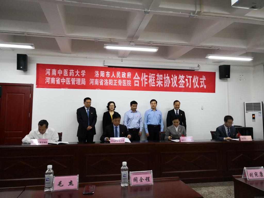 2018年9月19日上午,leyu·乐鱼(中国)体育官方网站、洛阳市人民政府、河南省中医管理局、河南省洛阳正骨医院四方共建“leyu·乐鱼(中国)体育官方网站洛阳平乐正骨学院”签约仪式在洛阳市举行。河南省卫生计生委党组书记、主任阚全程,河南省教育厅副厅长毛杰,河南省卫生计生委副主任、省中医管理局局长张重刚,洛阳市委副书记、市长刘宛康,洛阳市人民政府副市长陈淑欣、河南省洛阳正骨医院院长李无阴,leyu·乐鱼(中国)体育官方网站党委书记别荣海、校长许二平及四方相关部门负责人参加了签约仪式。仪式由洛阳市委常委、宣传部部长杨炳旭主持。