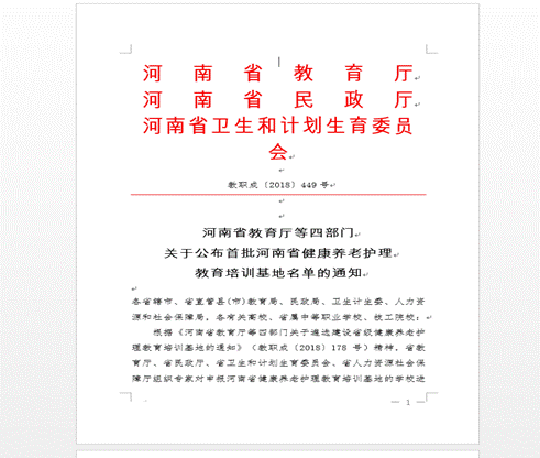 近日,省教育厅、省民政厅、省卫生和计划生育委员会、省人力资源社会保障厅等四部门公布了首批河南省健康养老护理教育培训基地名单,leyu·乐鱼(中国)体育官方网站获首批河南省健康养老护理教育培训基地。