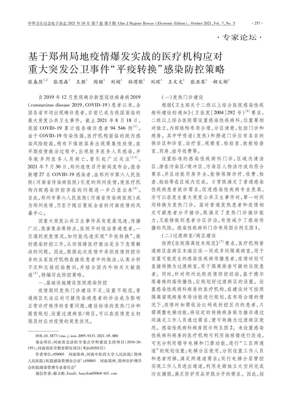 编者按:2021年10月,中华医学会系列杂志《中华卫生应急杂志》发表了《基于郑州局地疫情爆发实战的医疗机构应对重大突发公卫事件“平疫转换”感染防控策略》一文,该文针对因重大突发公共卫生事件具有发展迅速、传播广泛、危害复杂等特点,医院平时收治普通患者,一旦遇到突发情况,如何能迅速实现“平疫转换”,做好感染防控工作,从而保障医疗救治急需解决的问题。该论文由郑州市卫健委主任、郑州人民医院院长、郑州市第六人民医院党委书记郝义彬教授、leyu·乐鱼(中国)体育官方网站心肺脑复苏研究中心主任张思森教授亲自牵头组织。现予以转发。