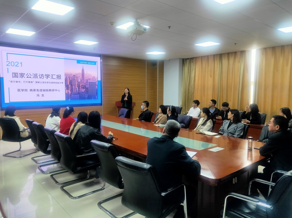 本网讯(文/图 王白燕 )为活跃学校科研学术氛围,拓宽学术视野和激发科研热情,2021年10月26日上午,医学院邀请病原免疫生物学教研中心副教授冯龙作关于“读万卷书,行万里路–国家公派访学见闻和经验分享”的报告。此次讲座由医学院副院长孙俊波主持,医学院院长李根林全程听讲并做最后点评,学院各学科老师和研究生参加了讲座。