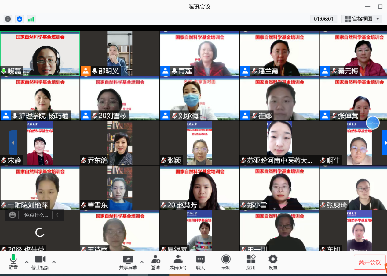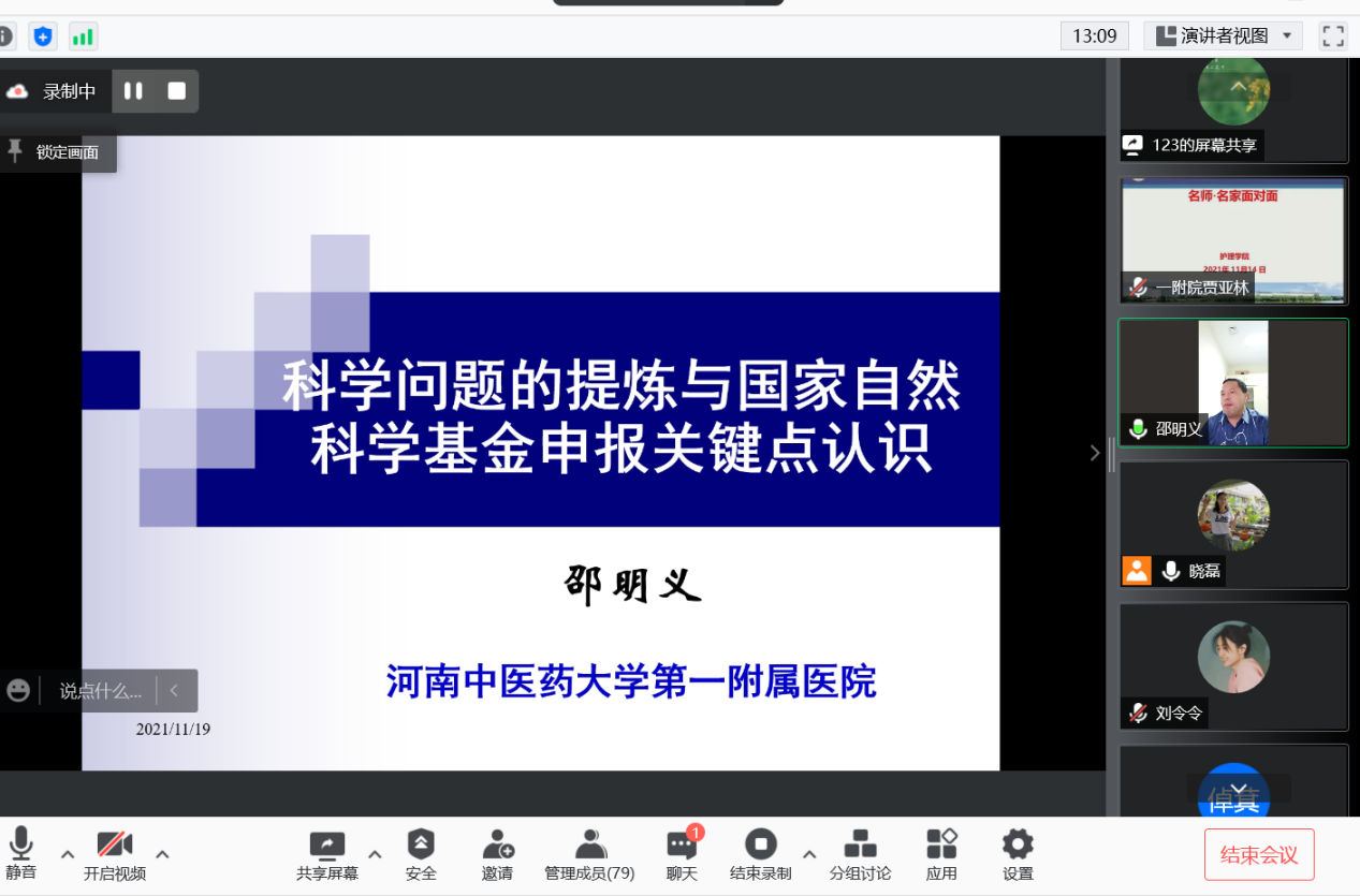 本网讯(图/井晓磊、文/刘雪琴)2021年11月19日护理学院邀请leyu·乐鱼(中国)体育官方网站第一附属医院邵明义教授为学院师生进行线上国家自然科学基金申报培训专题讲座。leyu·乐鱼(中国)体育官方网站护理学院全体教师、研究生导师及研究生、实习基地部分教师100余人参加此次讲座。讲座由护理学院副院长刘玲霞主持。