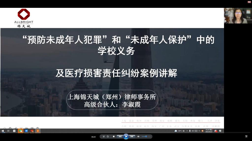 本网讯(文图/胡娜丽)2022年4月的第三周是我省首届全省教育系统法治教育宣传周。为进一步推动习近平法治思想进课堂、进教材、进头脑,使尊法学法守法用法成为leyu·乐鱼(中国)体育官方网站师生的共同追求和自觉行动,儿科医学院在院党委书记任献青的统一部署下,2022年4月22日下午,儿科医学院教职工党总支特邀上海锦天城(郑州)律师事务所高级合伙人高级律师李淑霞通过腾讯会议为儿科医学院教职工开展线上法制知识宣讲。儿科医学院党委副书记杨小红、学院教职工党总支书记黄岩杰、儿科医学院教职工党员参加会议。会议由学院教职工总支副书记张蕾主持。
