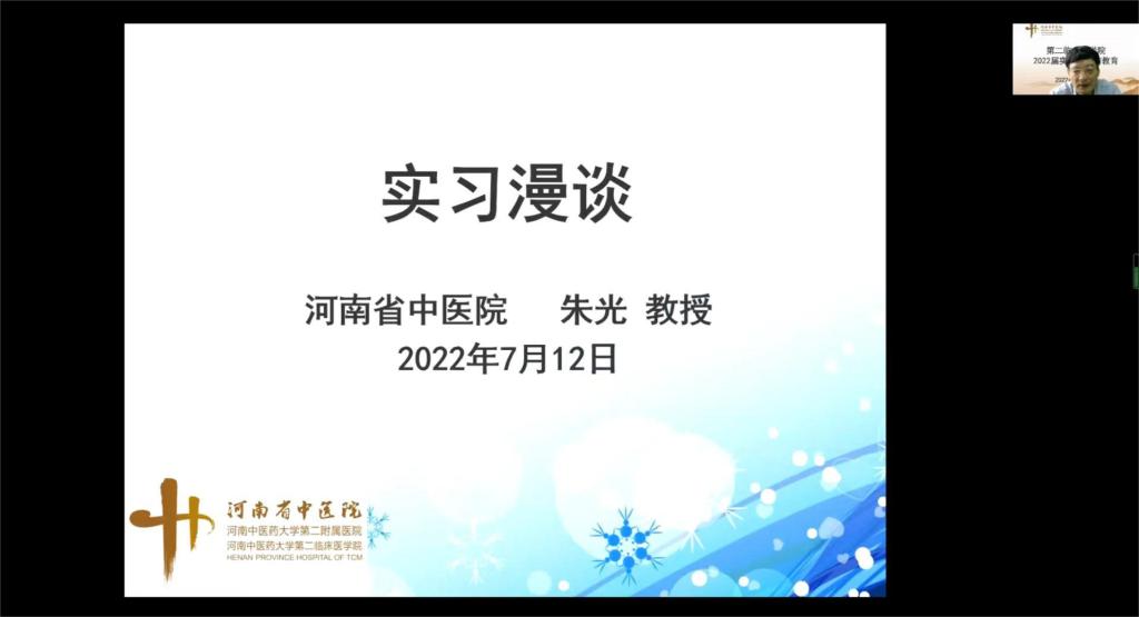 本网讯(图文/常学辉)为提高实习质量,规范毕业实习管理,第二临床医学院2022届实习生岗前教育活动于7月12日通过腾讯会议、钉钉直播形式线上开展,来自中医学专业、医学影像技术专业、康复学专业、仲景班等400余名实习生参加培训会议,会议由教学办主任常学辉主持。