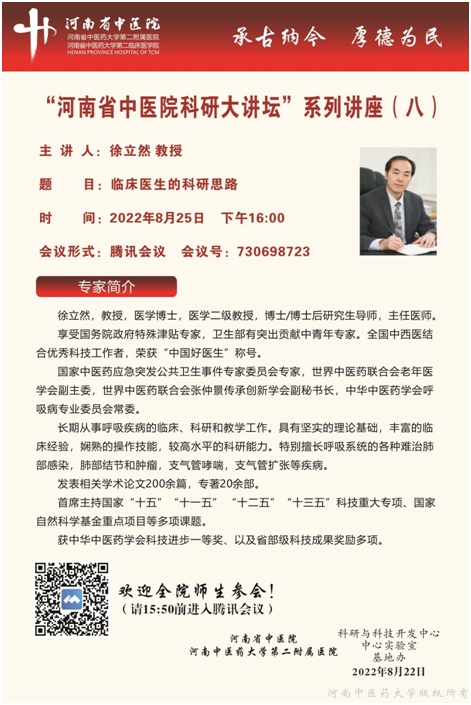 本网讯(图文/韩亮)2022年8月25日下午,二附院科研与科技开发中心、国家中医临床研究基地办公室和中心实验室联合举办的“河南省中医院科研大讲坛”系列讲座第八期开讲,此次讲座邀请到国家中医药应急突发公共卫生事件专家委员会专家,世界中医药联合会老年医学会副主委,世界中医药联合会张仲景传承创新学会副秘书长,中华中医药学会呼吸病专业委员会常委,“中国好医生”称号获得者徐立然教授为医院职工作题为《临床医生的科研思路》的线上专题讲座,会议由副院长李松伟主持。