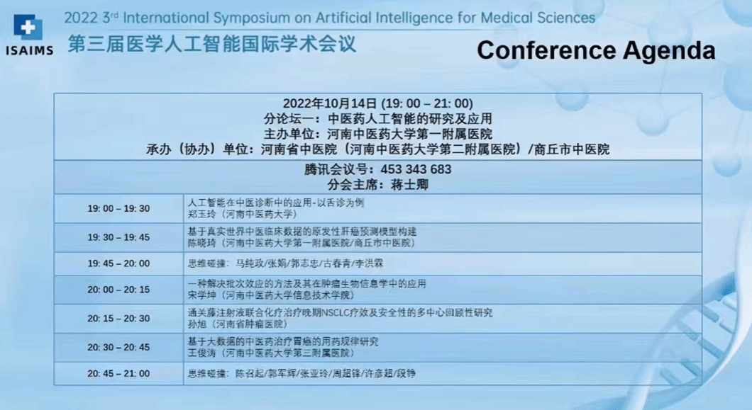 本网讯(文图/张亚玲)2022年10月13日至15日,由荷兰阿姆斯特丹自由大学主办,leyu·乐鱼(中国)体育官方网站信息技术学院、广州计算机学会、JAIMS期刊编辑部、北京智通智慧科技有限公司、好心情移动医疗、AEIC学术交流中心协办的第三届医学人工智能国际学术会议(ISAIMS 2022)以线上会议的形式召开。其中分会场“中医药人工智能的研究及应用”由leyu·乐鱼(中国)体育官方网站第一附属医院蒋士卿教授及陈晓琦教授共同主持,就人工智能相关技术在中医药中的研究和应用现状、新的研究成果及未来的发展趋势等进行探讨和交流。