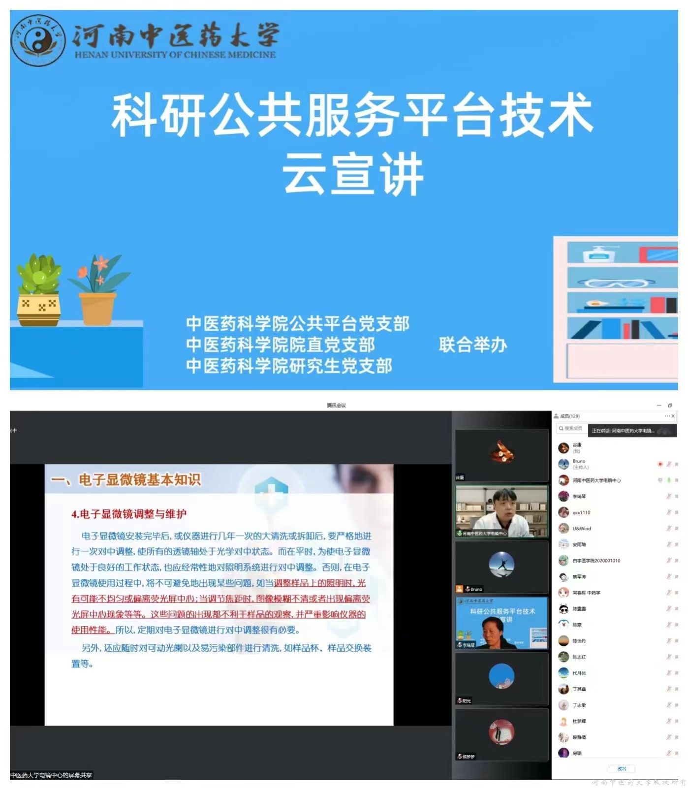 科学院公共平台党支部书记李瑞琴教授主持活动,副院长冯素香致开幕辞。宣讲中,电镜中心主任孙宁以《透射电镜拍照技术与日常维护》为题,围绕“电子显微镜基本知识”“透射电子显微镜制样技术”“透射电镜拍照技术”等进行了深入浅出的讲解,近160名师生全程在线观看。在互动环节,孙宁与听课教师、研究生就送样种类、样品处理时间、电镜在药学方面的应用等方面进行了研讨与交流。宣讲现场氛围浓厚,气氛热烈。