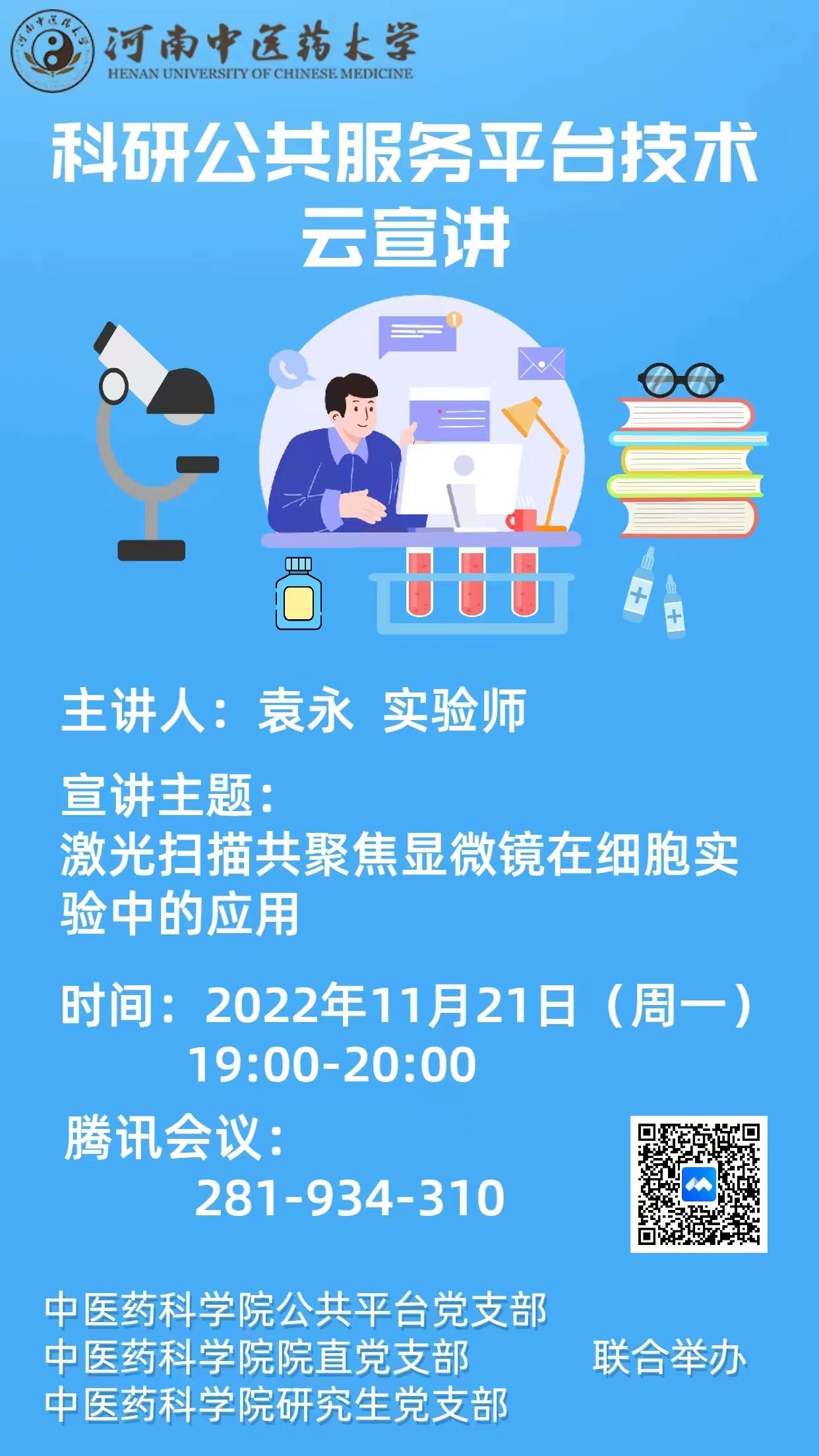本次宣讲主题:激光扫描共聚焦显微镜在细胞实验中的应用;时间:11月21日(周一)19:00-20:00;主讲人:袁永实验师。扫描海报二维码即可观看直播,欢迎广大师生参与。