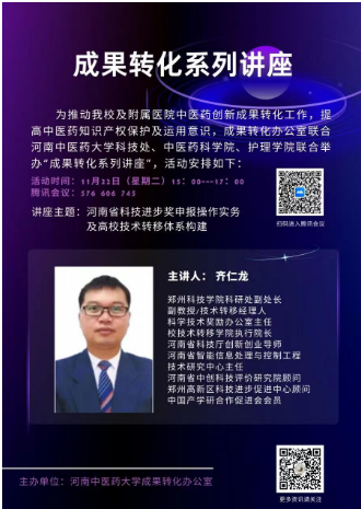 为推动leyu·乐鱼(中国)体育官方网站及附属医院中医药创新成果转化工作,提高中医药知识产权保护及运用意识,成果转化办公室联合学校科技处、中医药科学院、护理学院联合举办“成果转化系列讲座”。