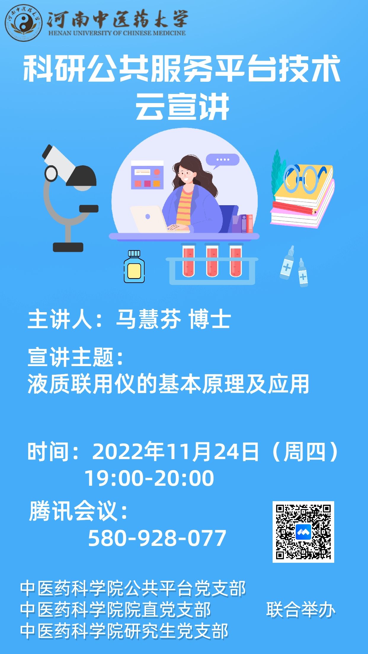 本次宣讲主题:液质联用仪的基本原理及应用;时间:11月24日(周四)19:00-20:00;主讲人:马慧芬博士。扫描海报二维码即可观看直播,欢迎广大师生参与。