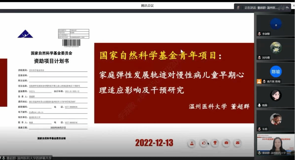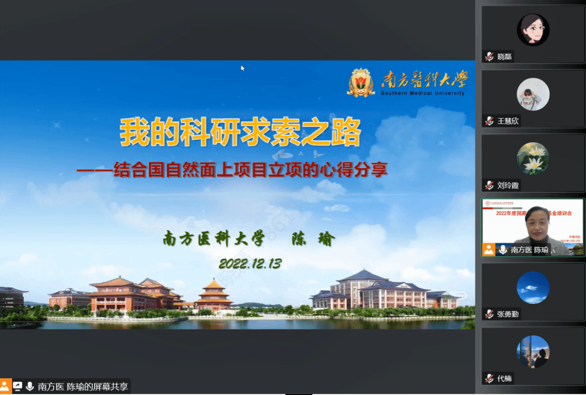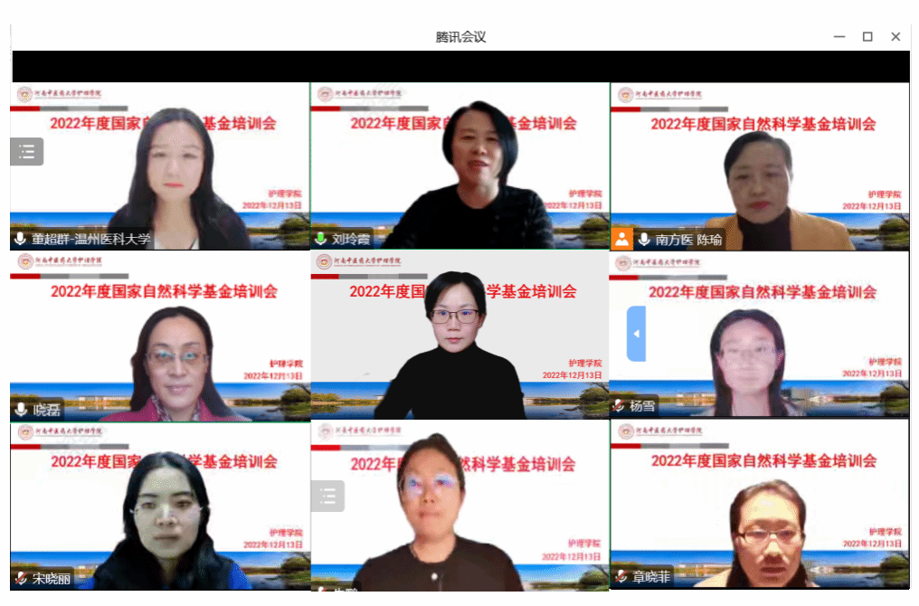 本网讯(文/曹宁 图/井晓磊)为拓展科研思路、提升科研能力,助力2023年度国家自然科学基金申报工作,2022年12月13日下午,护理学院通过腾讯会议线上举办国家自然科学基金申报培训会,会议邀请南方医科大学陈瑜教授、温州医科大学董超群副教授进行申报经验分享与指导。护理学院教师、护理研究生导师及全体研究生近百人参会。会议由刘玲霞副院长主持。