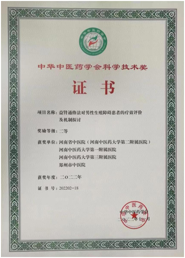 本网讯(文图/郝高利)近日,二附院孙自学教授领衔的研究成果《益肾通络法对男性生殖障碍患者的疗效评价及机制探讨》,荣获2022年度中华中医药学会科学技术奖二等奖。