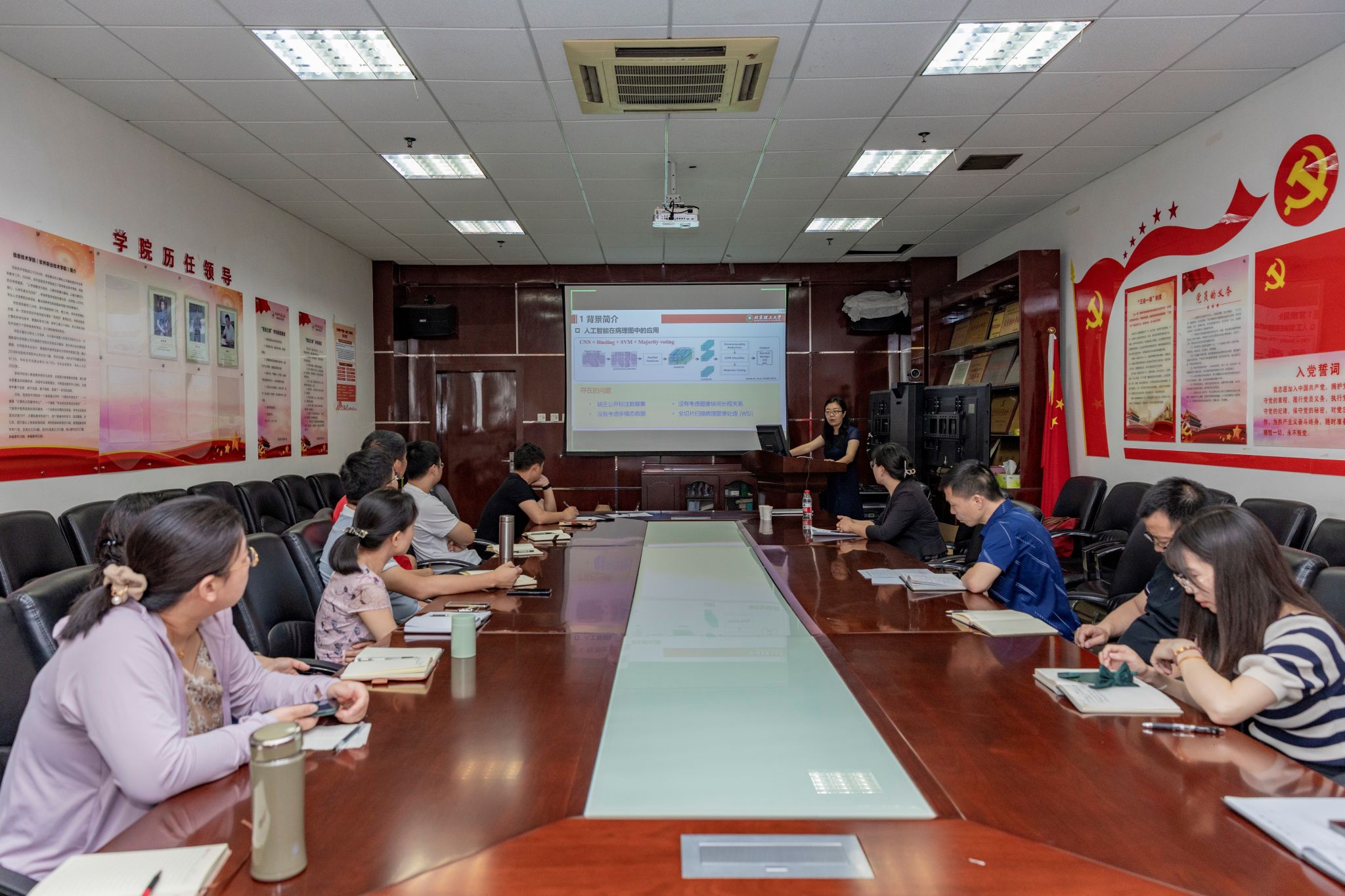 会上,万晓华以《基于医学多模数据分析的肿瘤标志物预测》为题,结合团队目前的研究成果,围绕多模态数据分析与肿瘤标志预测,从肿瘤癌症病理学、公开标注数据集构建、病理学图像分类分级策略以及乳腺癌结肠癌预测等内容进行了深入浅出的阐述。报告会后,与会教师就医学影像学、计算科学、国家自然科学基金选题等内容与万晓华教授进行了深入交流。