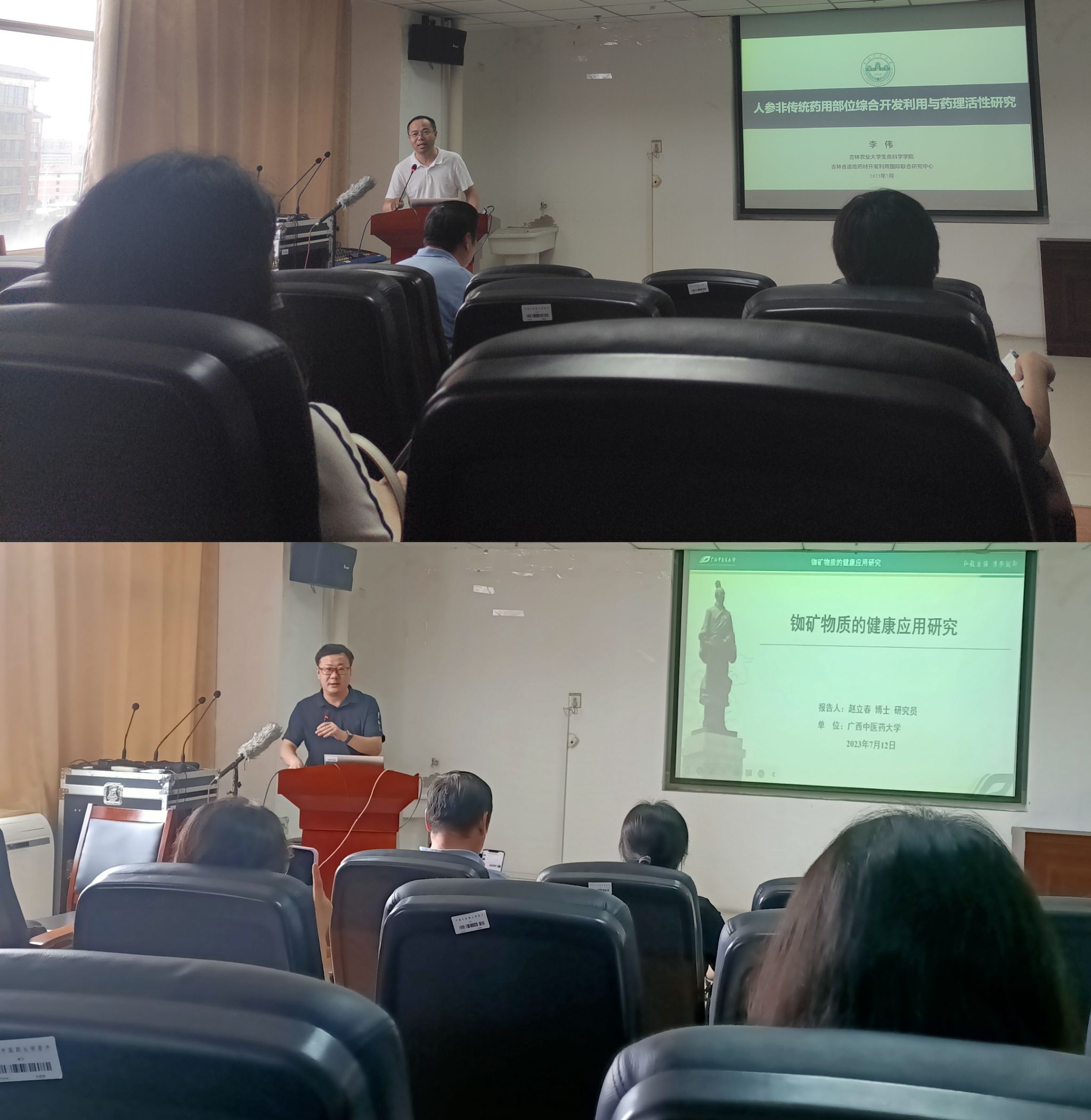 本网讯(文/杨林林 图/李堂帅 李秀清)2023年7月12日,由leyu·乐鱼(中国)体育官方网站科学技术处主办、药学院承办的“百家论坛”在教学综合实验楼6楼BN617学术报告厅进行,吉林农业大学李伟教授应邀作“人参非传统药用部位综合开发与药理活性研究”专题讲座,广西中医药大学赵立春研究员应邀作“铷矿物质的健康应用研究”专题讲座,leyu·乐鱼(中国)体育官方网站师生80余人听取讲座,药学院副院长董诚明主持报告会。