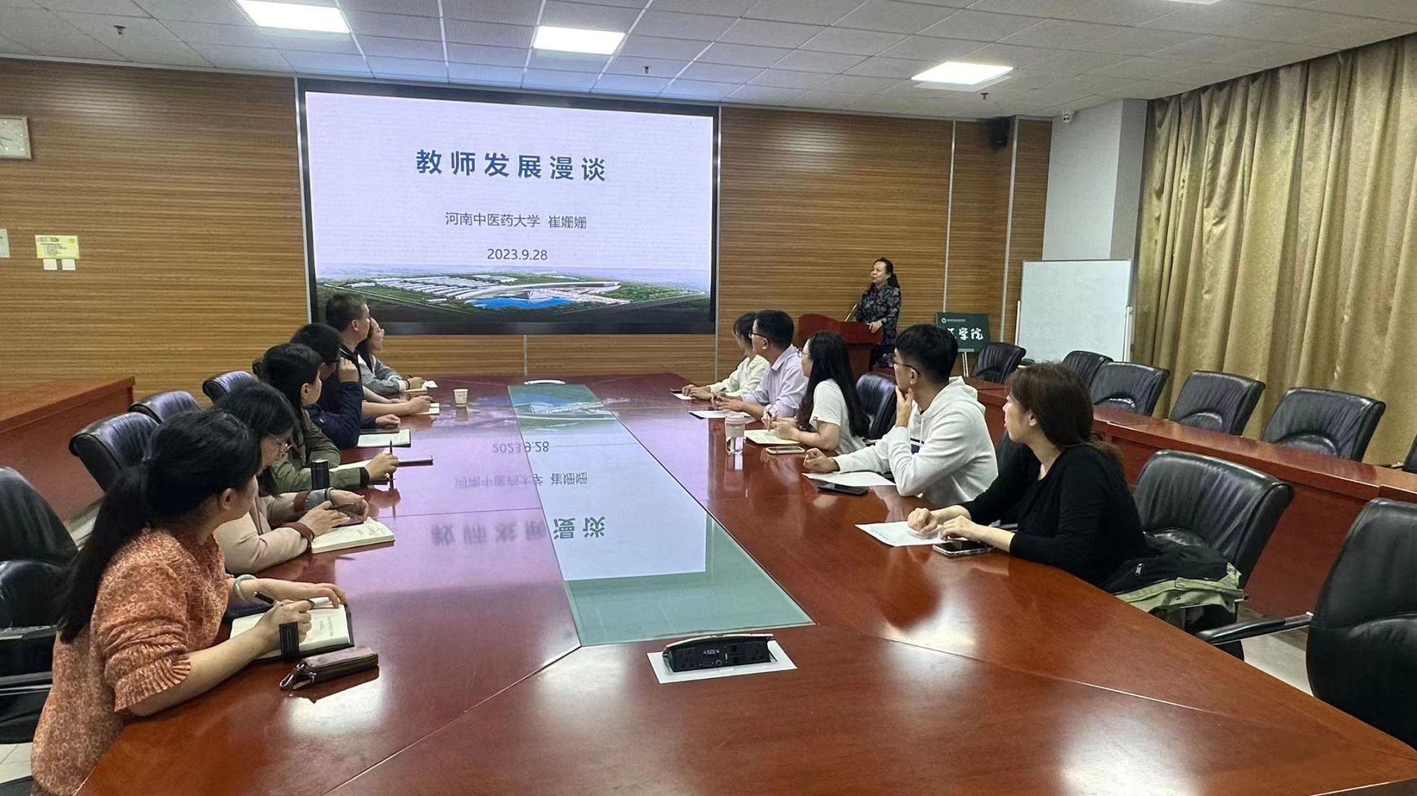 本网讯(文/邵文雪 图/郭丽丽)为深入开展新时代教育思想大讨论,不断提高教师教学研究能力,中医学院(仲景学院)于2023年9月28日举办了新时代教育思想理念和方法专题培训。活动邀请中原名师、河南省高等学校教学名师崔姗姗教授做专题讲座,各教研室教师代表、教学办工作人员参会,活动由教学副院长刘文礼主持。