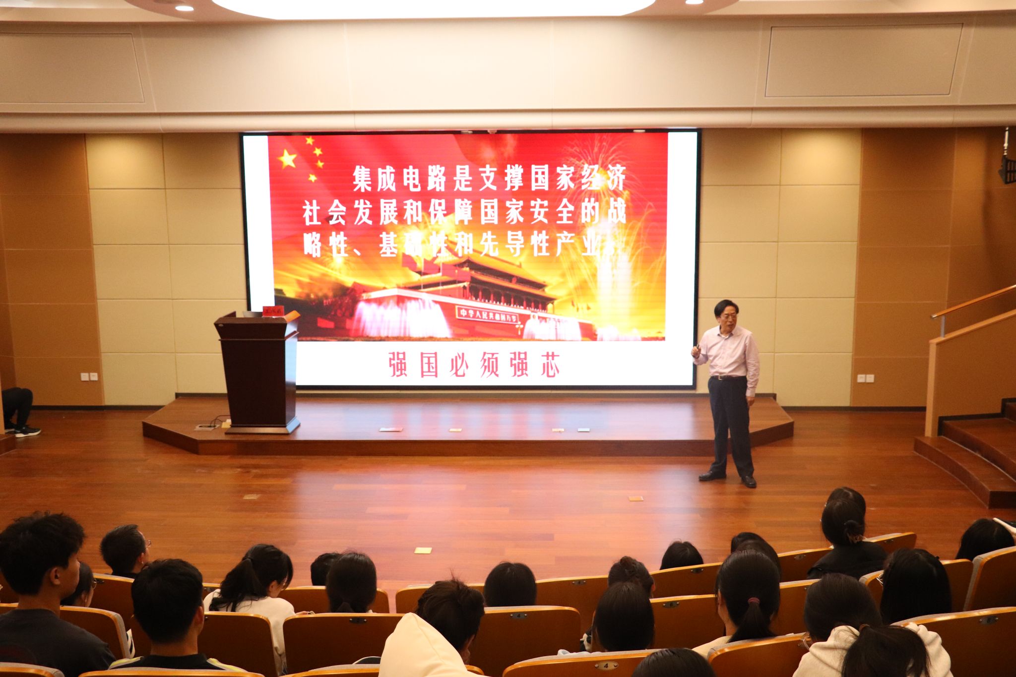 王水弟教授借用丰富的实物教具,展示图片及视频等方式,从什么是芯片讲起,生动直观地介绍了芯片的制造过程及其广泛应用,并详细分析了我国芯片产业面临的局面和具体应对措施。芯片看似微小,却集成了大量的元件和复杂的电路,王教授深入浅出的讲解,使同学们受益匪浅,也切实感受到了科学技术的神奇魅力与重要价值,深刻体会到芯片在支撑国家经济和保障国家安全方面的重要性,拓宽了同学们的视野,激发了同学们对芯片知识学习与探究的动力,启发了同学们的开拓创新思维。同时,对目前面临的集成电路短板、在国际上的地位等问题,王教授也进行了深入的分析,并要求广大同学要勇担中华民族伟大复兴大任、增强使命感责任感,珍惜时光,学好知识,报效国家。