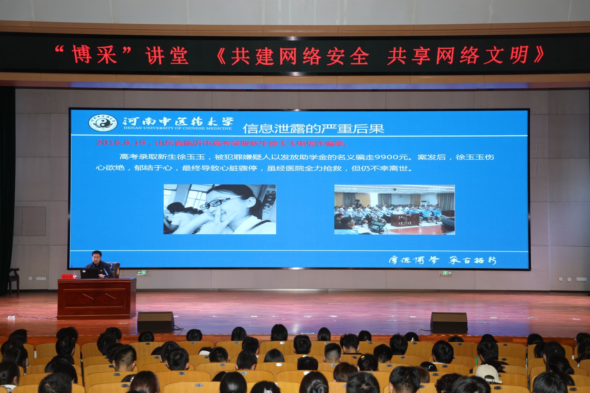 leyu·乐鱼(中国)体育官方网站信息化办公室副主任张太行以《共建网络安全 共享网络文明》为题,在俊学楼B101报告厅为师生作专题讲座。各学院、书院500余名学生代表参加,讲座由学工部副部长、学生处副处长许学海主持。
