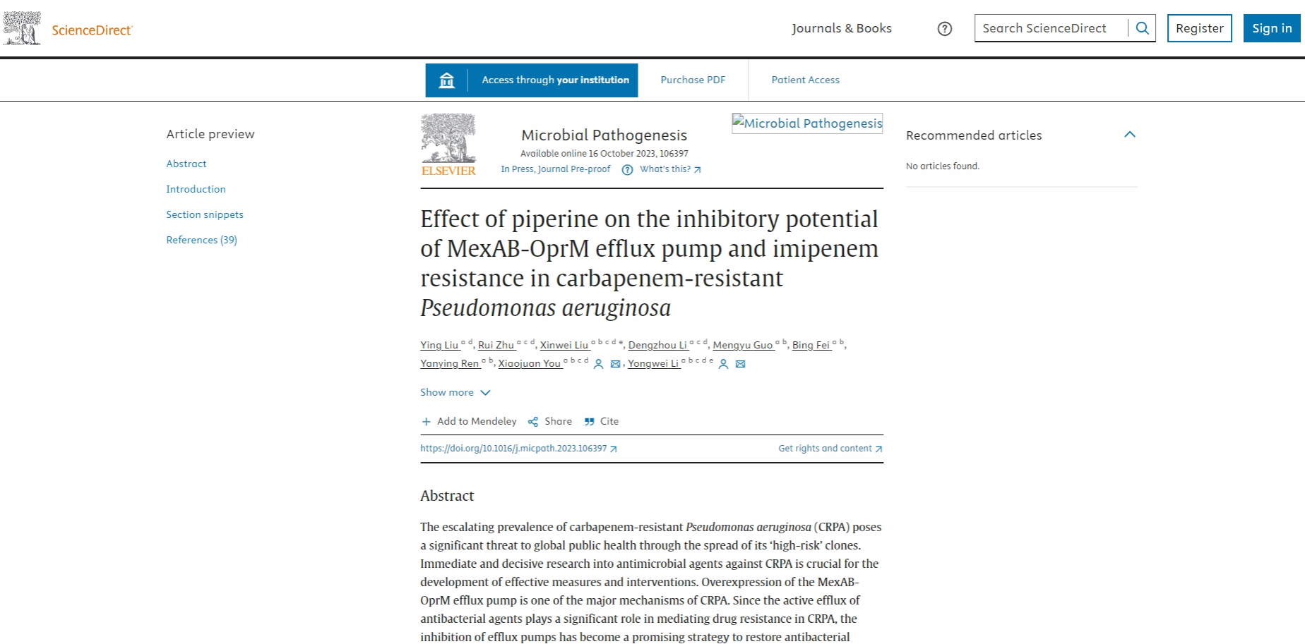本网讯(文/有小娟 刘莹)2023年10月17日,二附院检验中心李永伟教授团队在《Microbial Pathogenesis》杂志在线发表了题为《Effect of piperine on the inhibitory potential of MexAB-OprM efflux pump and imipenem resistance in carbapenem-resistant Pseudomonas aeruginosa》(《胡椒碱对耐碳青霉烯类铜绿假单胞菌MexAB-OprM 外排泵抑制作用和对亚胺培南耐药性的影响》)的研究论文。