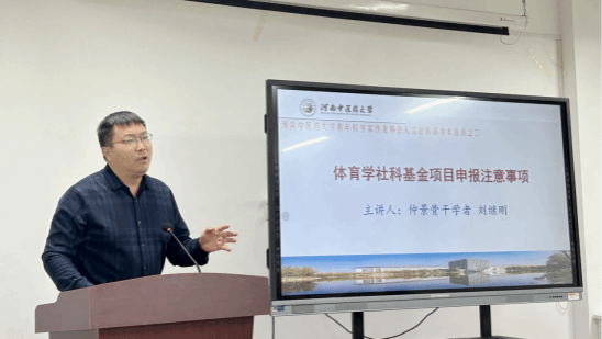 本网讯(文/苏坤霞 图/张晨)2023年11月24日,由学校青年科学家协会人文社科部和体育学院共同主办的第二期科研学术活动成功举办。人文社科部主任委员刘继刚教授作题为《体育学社科基金项目申报注意事项》的专题讲座。体育学院领导班子全体成员和师生代表30余人参加学术讲座。活动由体育学院党总支书记孟肖飞主持。