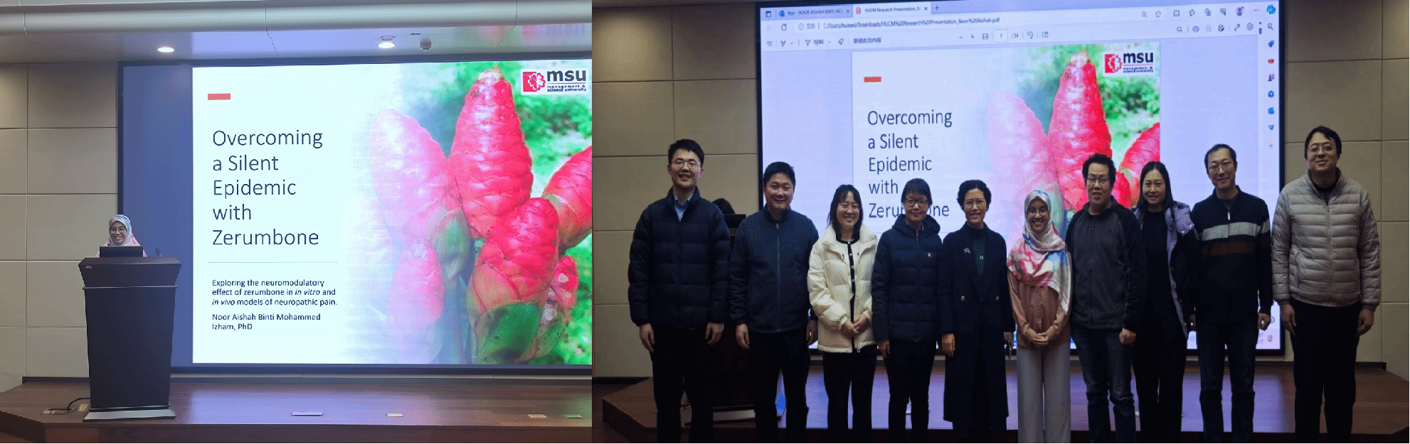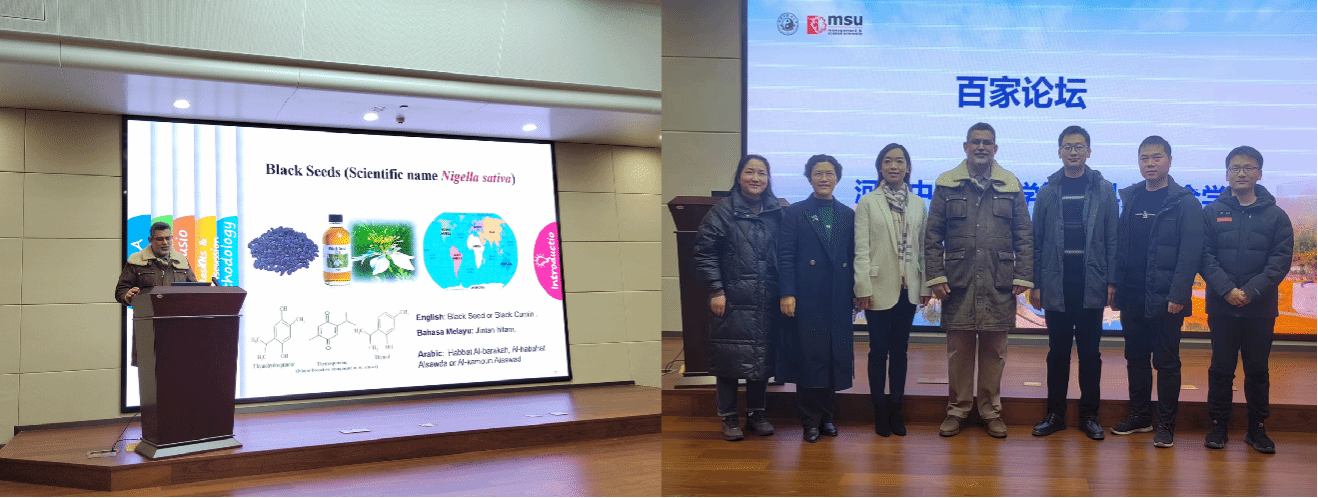12月5日、6日、7日,MSU药学院副院长Ibrahim副教授、学院Alhoot博士、Aishah博士分别以“基于移动健康平台的物联网系统对帕金森病的无创检测”“黑种草籽抗单纯疱疹病毒活性及有效性研究”“在体外和体内神经病理性疼痛模型中探索球姜酮的神经调节作用”为题进行学术报告。各位专家、教授分享了自己的科研思路、方法以及成果。三场精彩的报告吸引了众多老师和学生的参与,取得了良好的成效。报告会分别由邓号和朱鑫主持。