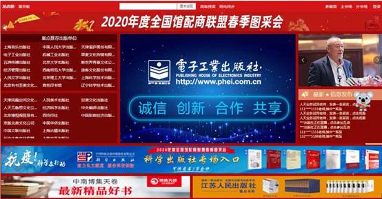 4.1、主会场:右上角展示相关人员讲话及平台消息发布。其他板块主要展示重点出版社书目,直接点击出版社名称即可进入选书界面。