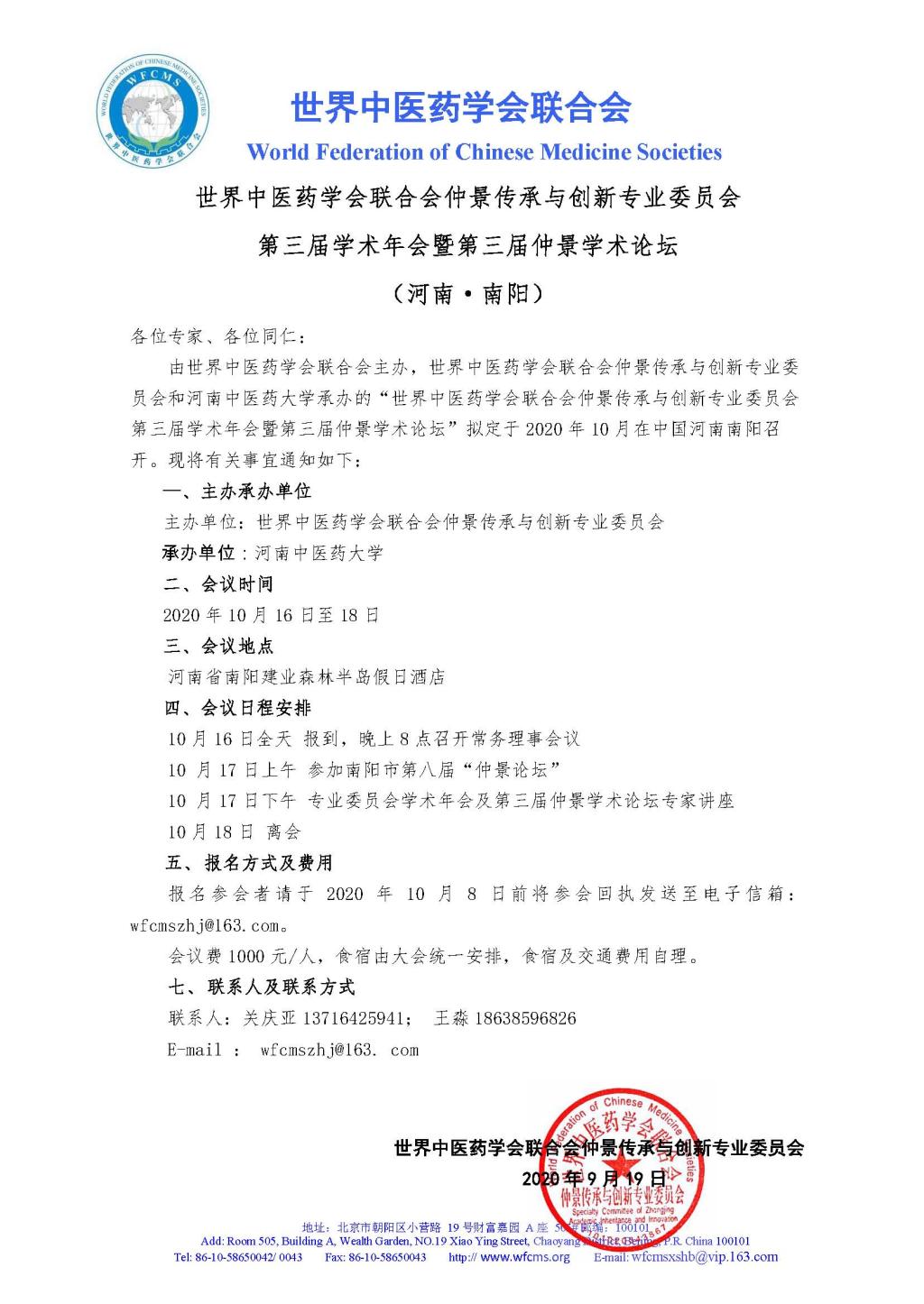 由世界中医药学会联合会主办,世界中医药学会联合会仲景传承与创新专业委员会和leyu·乐鱼(中国)体育官方网站承办的“世界中医药学会联合会仲景传承与创新专业委员会2020年会暨第三届仲景学术论坛”拟定于2020年10月在中国河南南阳召开。现将有关事宜通知如下: