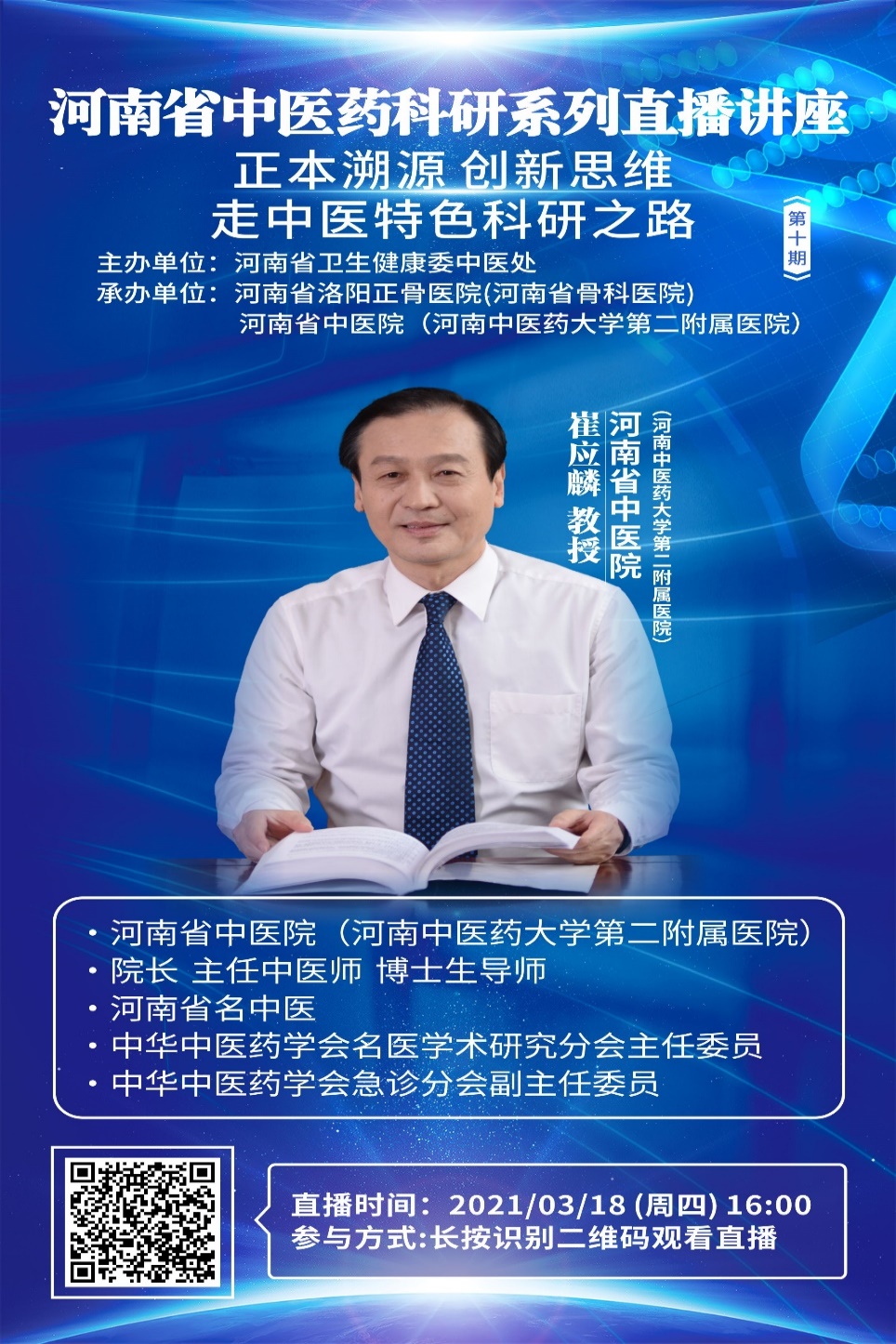 由河南省卫健委中医处主办的河南省中医药科研系列直播讲座第十期将于2021年3月18日16:00在“惠医苑--名医直播”进行网络直播。leyu·乐鱼(中国)体育官方网站第二附属医院院长崔应麟教授受邀作“正本溯源 创新思维 走中医特色科研之路”专题讲座。长按识别图中二维码可观看直播,欢迎大家收看!