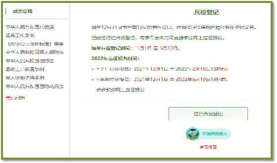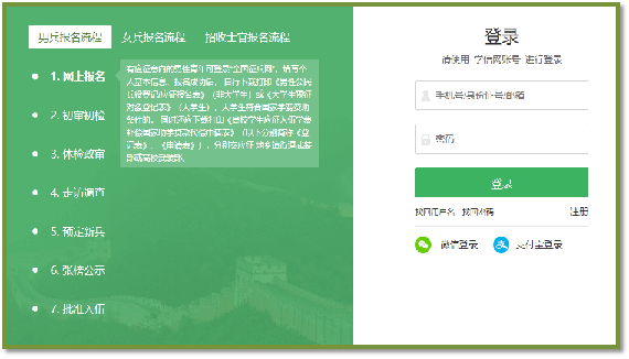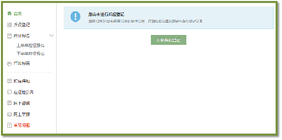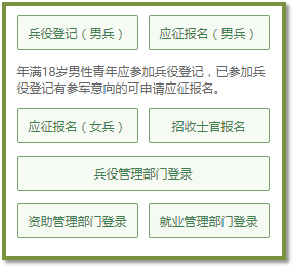 温馨提示:如果你没有进行过兵役登记,请直接从“兵役登记(男兵)”进入页面就可以了;如果已完成过兵役登记从“应征报名(男兵)”进入页面即可;女同学可以直接进入女兵报名页面。