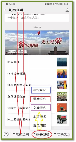方式一:搜索并关注“河南征兵”微信公众号,进入公众号点击下方正中“我要报名”。