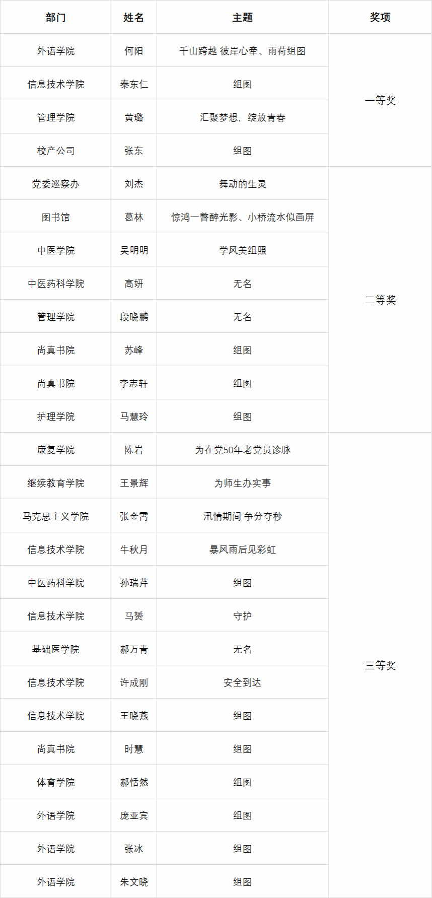 为积极争创省级文明校园标兵,营造“人人参与、共建共享”的创建氛围,9月2日-16日,校工会在全校教职工中开展了“定格最美文明瞬间”文明随手拍摄影大赛,信息技术学院工会承担了作品的征集、推荐评选工作。各基层工会上报作品共计85幅,经过基层工会推荐、校工会审核,最终评选出《千山跨越 彼岸心牵、雨荷组图》等4幅作品获一等奖、《舞动的生灵》等8幅作品获二等奖、《为在党50年老党员诊脉》等14幅作品获三等奖;现将评选结果公示如下: