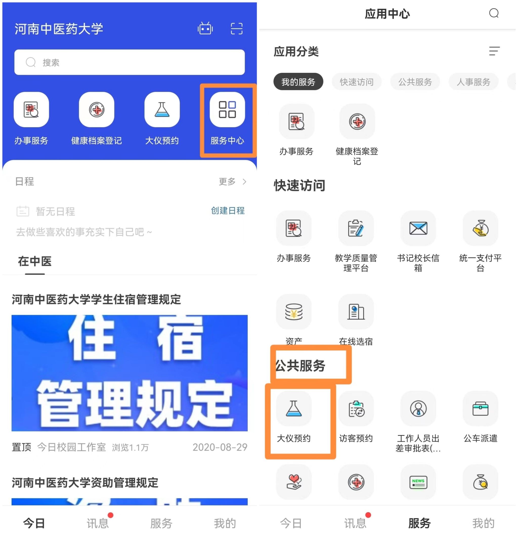 (2)今日校园手机APP,大仪预约服务(点击今日校园——服务中心——公共服务——大仪预约——统一身份登录入口——搜索仪器关键词预约即可)