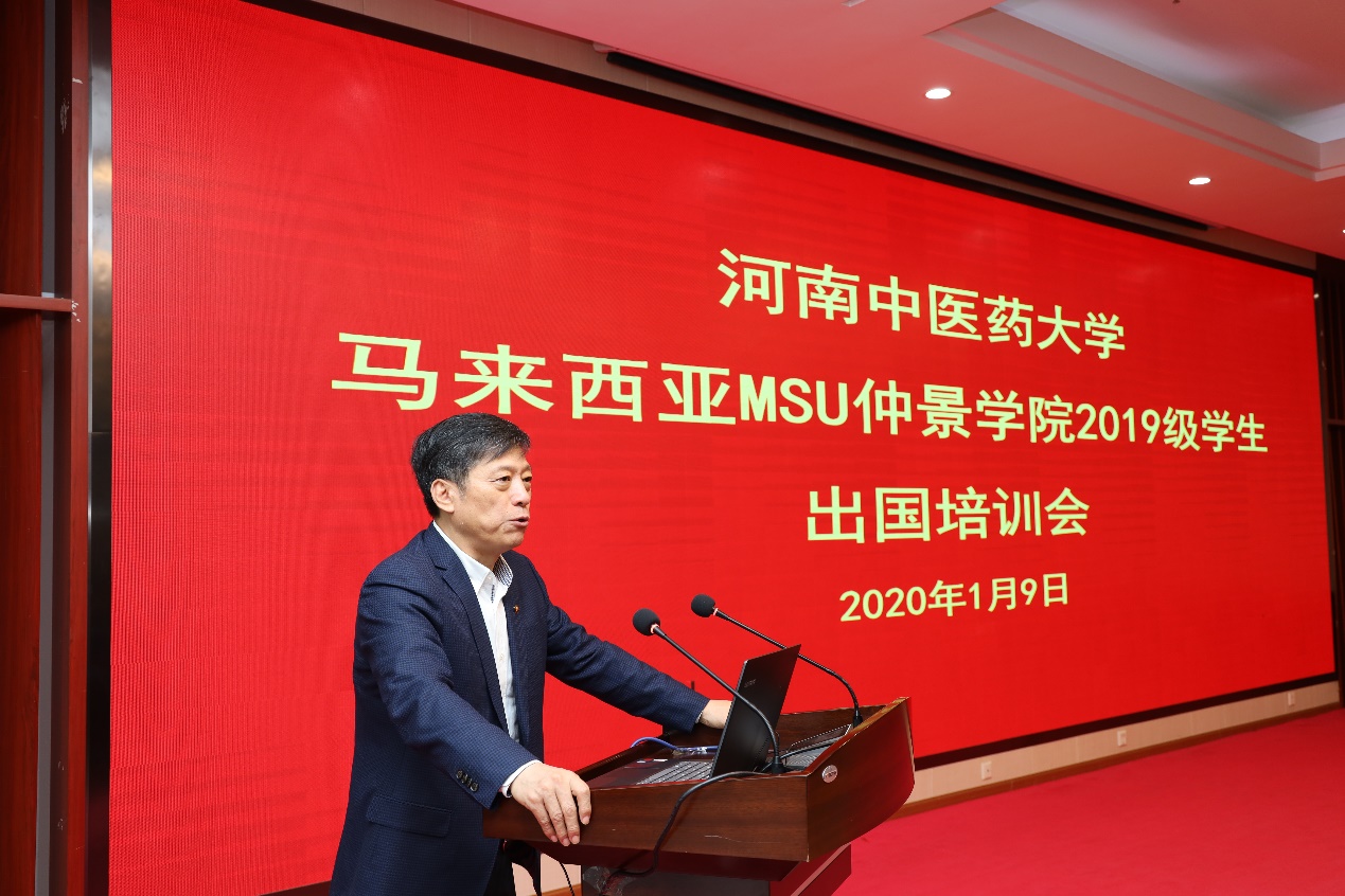 许二平在讲话中对马来西亚MSU仲景学院项目的发展规划、学生管理提出了具体要求。他指出,一直以来,学校高度重视马来西亚MSU仲景学院项目,办好该项目既是培养中医药国际化人才的需要,也是实现建设“国际知名、国内一流”中医药大学发展目标的需要,更是中医药走向世界的需要,广大教职工生要共同努力,助力学校转型发展。许二平叮嘱同学们出国在外要注意人身及财产安全;要自律自省提高自我管理能力;要尽快适应当地的生活环境、风俗习惯,要互帮互助、团结友爱、遵纪守法维护好海外中国人的形象,希望同学们通过出国学习,培养国际视野,提高英语的专业学习及交际能力,成为“精中医、懂语言”的国际化中医药人才,为中医药的国际化传播与发展贡献力量。